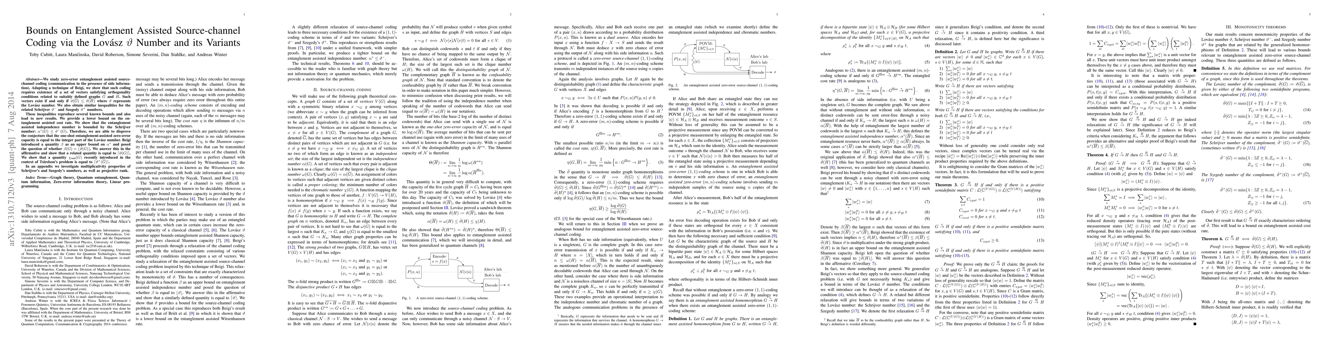 We study zero-error entanglement assisted source-channel coding (communication in the presence of side information). Adapting a technique of Beigi, we show that such coding requires existence of a set of vectors satisfying orthogonality conditions related to suitably defined graphs $G$ and $H$. Such vectors exist if and only if $\vartheta(\overline{G}) \le \vartheta(\overline{H})$ where $\vartheta$ represents the Lov\'asz number. We also obtain similar inequalities for the related Schrijver $\vartheta^-$ and Szegedy $\vartheta^+$ numbers. These inequalities reproduce several known bounds and also lead to new results. We provide a lower bound on the entanglement assisted cost rate. We show that the entanglement assisted independence number is bounded by the Schrijver number: $\alpha^*(G) \le \vartheta^-(G)$. Therefore, we are able to disprove the conjecture that the one-shot entanglement-assisted zero-error capacity is equal to the integer part of the Lov\'asz number. Beigi introduced a quantity $\beta$ as an upper bound on $\alpha^*$ and posed the question of whether $\beta(G) = \lfloor \vartheta(G) \rfloor$. We answer this in the affirmative and show that a related quantity is equal to $\lceil \vartheta(G) \rceil$. We show that a quantity $\chi_{\textrm{vect}}(G)$ recently introduced in the context of Tsirelson's conjecture is equal to $\lceil \vartheta^+(\overline{G}) \rceil$. In an appendix we investigate multiplicativity properties of Schrijver's and Szegedy's numbers, as well as projective rank.