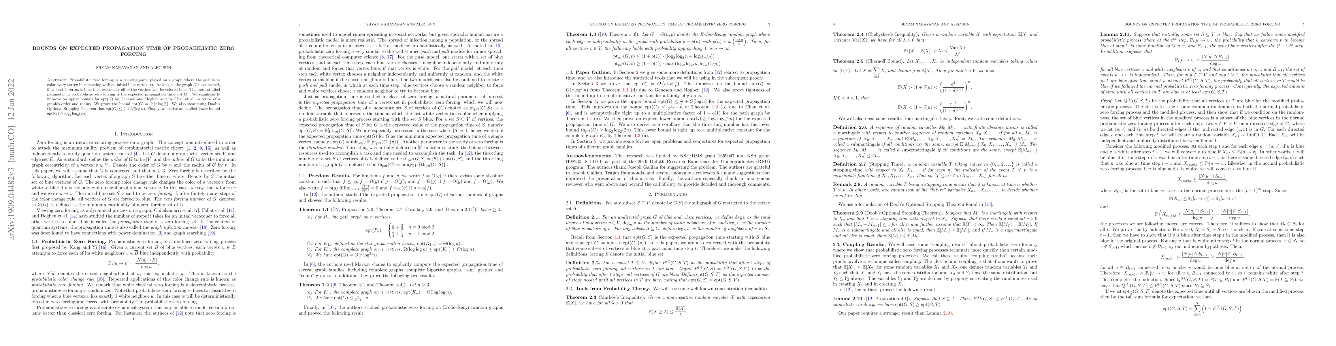 The paper presents novel bounds on the expected propagation time of probabilistic zero forcing, refining previous upper bounds and introducing a new lower bound using Doob's Optional Stopping Theorem and cornerstones in graph theory.