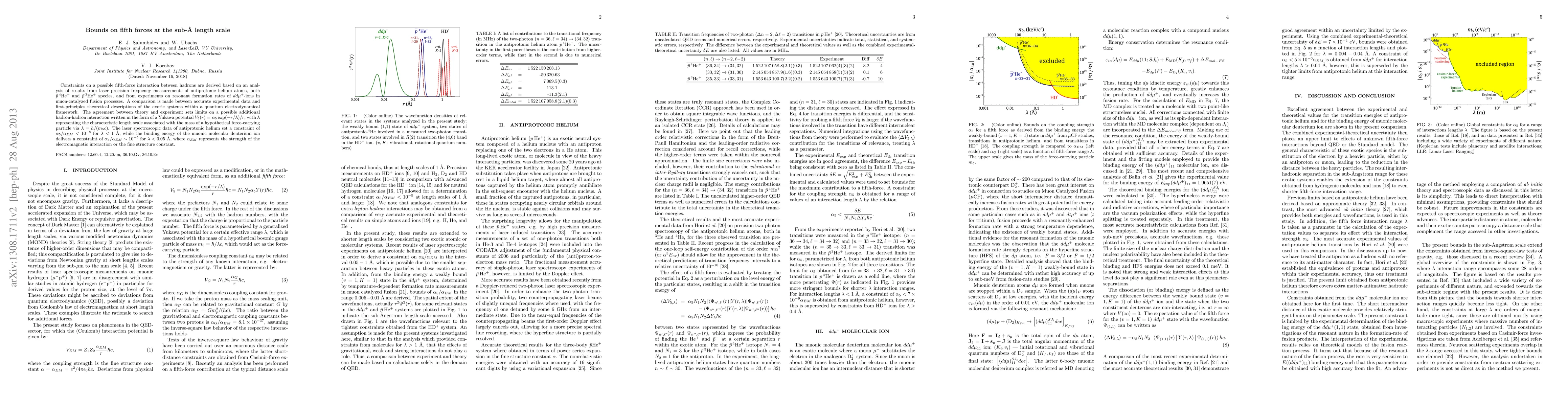 Constraints on a possible fifth-force interaction between hadrons are derived based on an analysis of results from laser precision frequency measurements of antiprotonic helium atoms, both $\bar{p}\,^{4}$He$^{+}$ and $\bar{p}\,^{3}$He$^{+}$ species, and from experiments on resonant formation rates of $dd\mu^{+}$-ions in muon-catalyzed fusion processes. A comparison is made between accurate experimental data and first-principles theoretical descriptions of the exotic systems within a quantum electrodynamical framework. The agreement between theory and experiment sets limits on a possible additional hadron-hadron interaction written in the form of a Yukawa potential $V_5(r)=\alpha_5 \exp(-r/\lambda)/r$, with $\lambda$ representing the characteristic length scale associated with the mass of a hypothetical force-carrying particle via $\lambda=\hbar/(m_5c)$. The laser spectroscopic data of antiprotonic helium set a constraint of $\alpha_5/\alpha_{EM} < 10^{-8}$ for $\lambda < 1$ \AA, while the binding energy of the muonic molecular deuterium ion delivers a constraint of $\alpha_5/\alpha_{EM} \sim 10^{-5}$ for $\lambda < 0.05$ \AA, where $\alpha_{EM}$ represents the strength of the electromagnetic interaction or the fine structure constant.