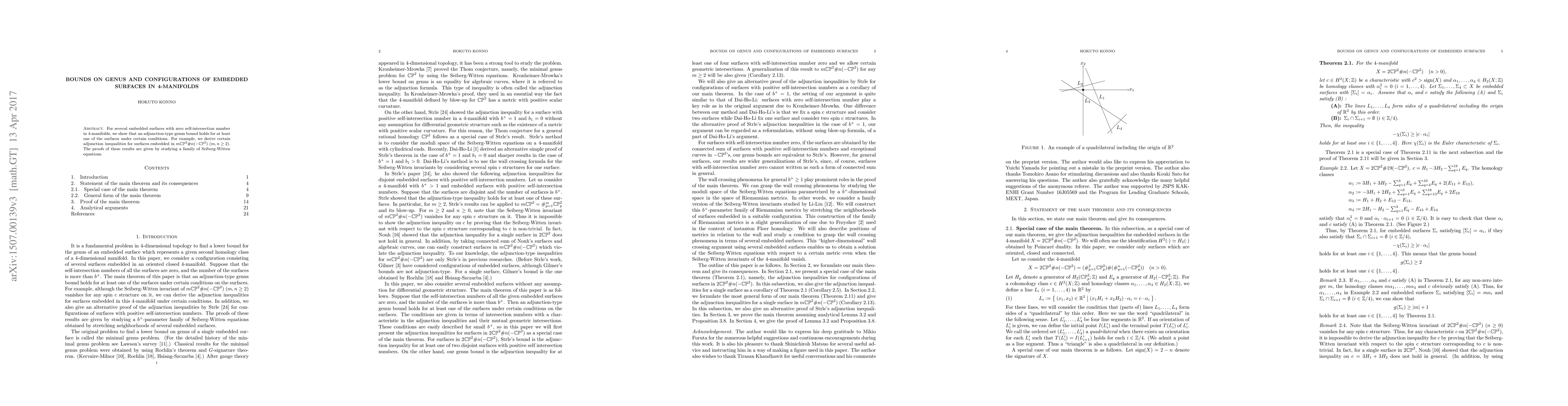 Researchers found bounds on the genus and configurations of embedded surfaces in 4-manifolds, including specific inequalities for certain types of surfaces, which were proven using Seiberg-Witten equations.