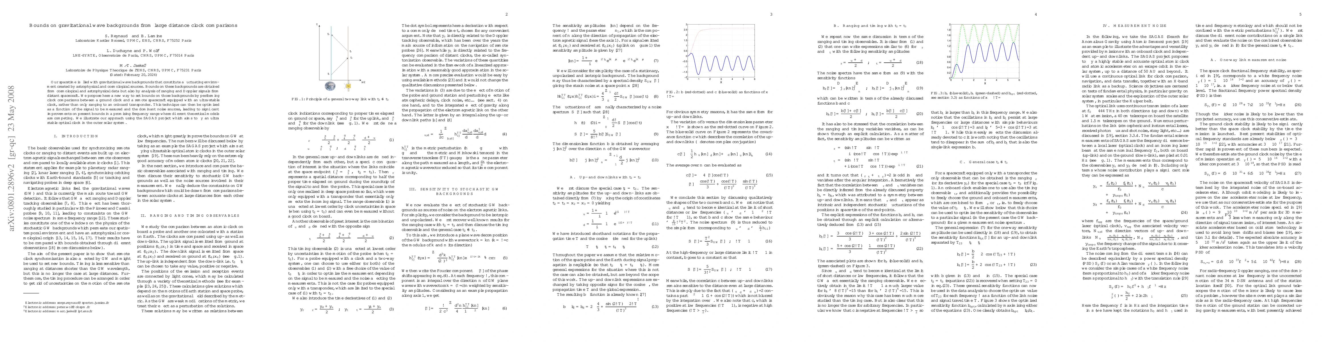 Our spacetime is filled with gravitational wave backgrounds that constitute a fluctuating environment created by astrophysical and cosmological sources. Bounds on these backgrounds are obtained from cosmological and astrophysical data but also by analysis of ranging and Doppler signals from distant spacecraft. We propose here a new way to set bounds on those backgrounds by performing clock comparisons between a ground clock and a remote spacecraft equipped with an ultra-stable clock, rather than only ranging to an onboard transponder. This technique can then be optimized as a function of the signal to be measured and the dominant noise sources, leading to significant improvements on present bounds in a promising frequency range where different theoretical models are competing. We illustrate our approach using the SAGAS project which aims to fly an ultra stable optical clock in the outer solar system.
