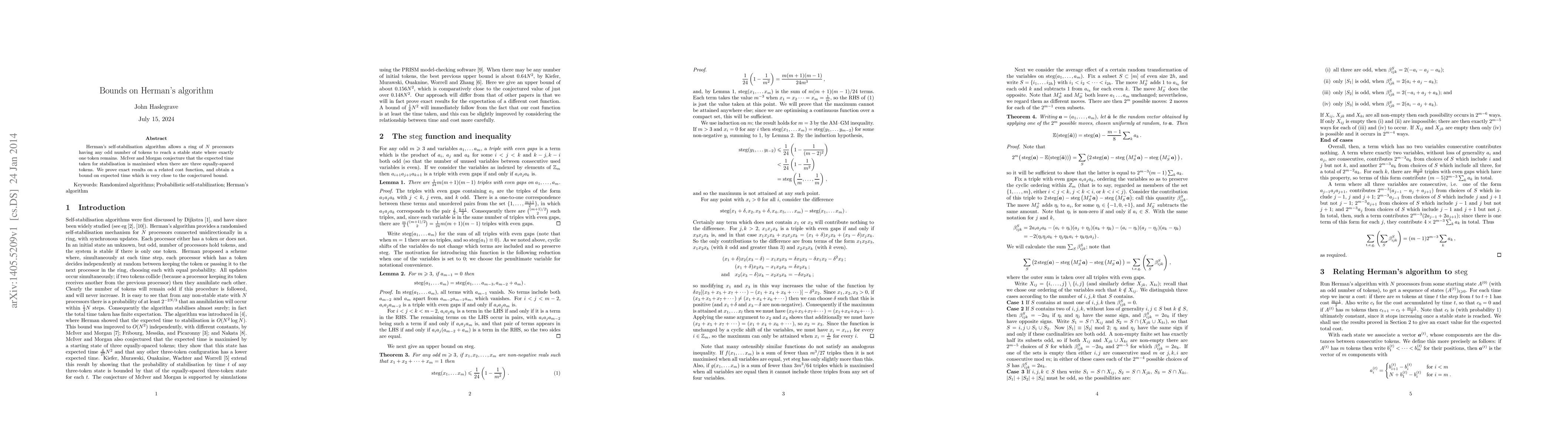 Herman's self-stabilisation algorithm allows a ring of $N$ processors having any odd number of tokens to reach a stable state where exactly one token remains. McIver and Morgan conjecture that the expected time taken for stabilisation is maximised when there are three equally-spaced tokens. We prove exact results on a related cost function, and obtain a bound on expected time which is very close to the conjectured bound.