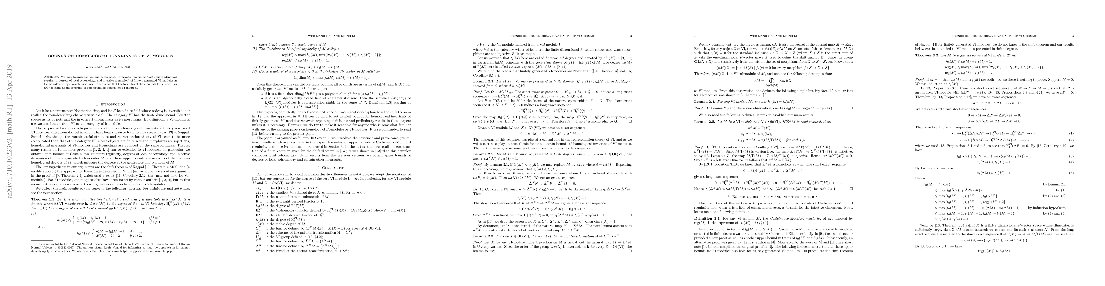 This paper establishes bounds for key homological invariants of finitely generated VI-modules, revealing that these bounds are identical to those for FI-modules in the non-describing characteristic case.