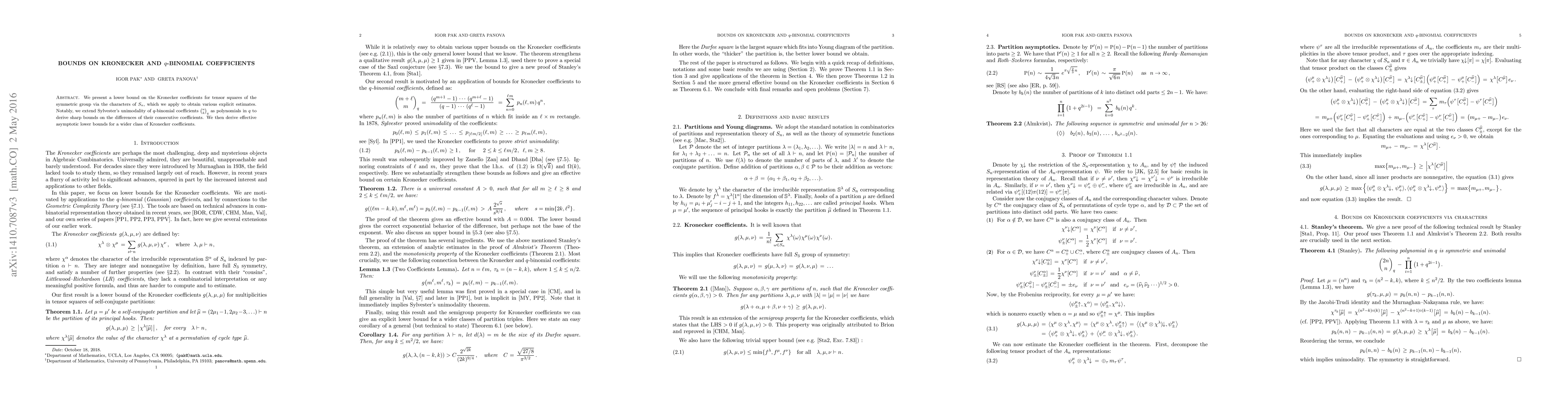 The paper establishes a lower bound for Kronecker coefficients of tensor squares of the symmetric group using character theory and extends Sylvester's unimodality results for $q$-binomial coefficients, providing sharp bounds on their differences. Additionally, it derives effective asymptotic lower bounds for a broader range of Kronecker coefficients.