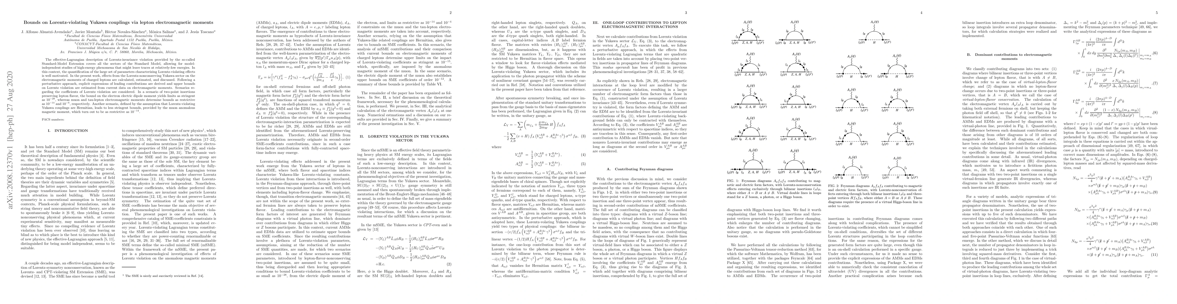This paper investigates Lorentz-violating Yukawa couplings' effects on the electromagnetic moments of charged leptons using the Standard-Model Extension. It derives upper bounds on Lorentz violation from current data, finding stringent limits of $10^{-28}$ for the electron electric dipole moment and less restrictive bounds of $10^{-14}$ for the muon anomalous magnetic moment.