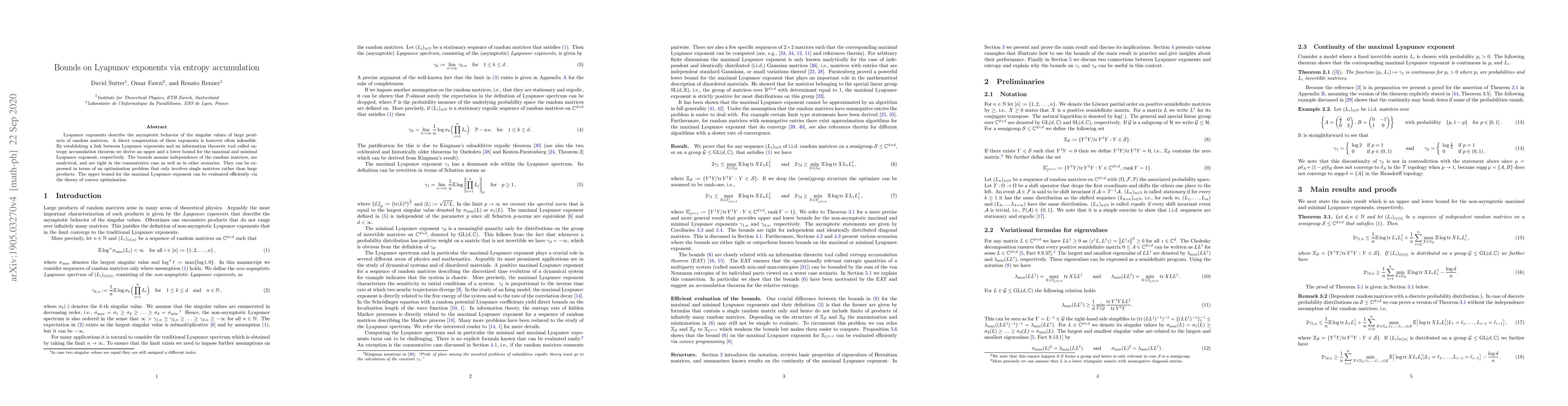 This paper establishes bounds for Lyapunov exponents using the entropy accumulation theorem, providing analytical upper and lower bounds that are tight in specific cases. The bounds are efficiently computable via convex optimization and require only single matrices rather than large products.