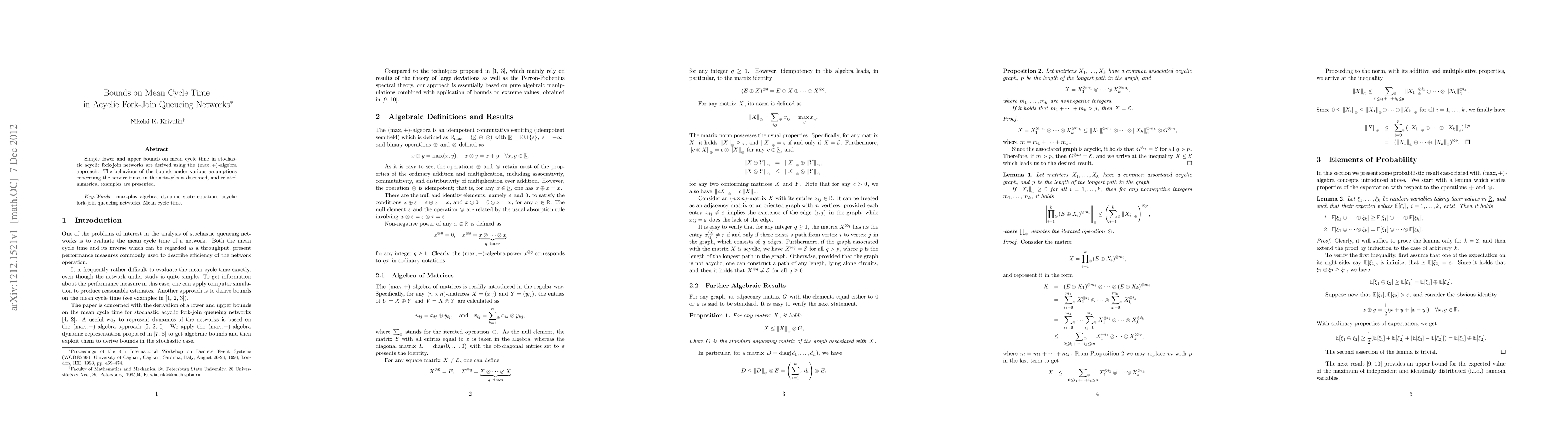 This paper derives simple lower and upper bounds for the mean cycle time in stochastic acyclic fork-join networks using the $(\max,+)$-algebra approach, and examines their behavior under different service time assumptions with numerical examples.