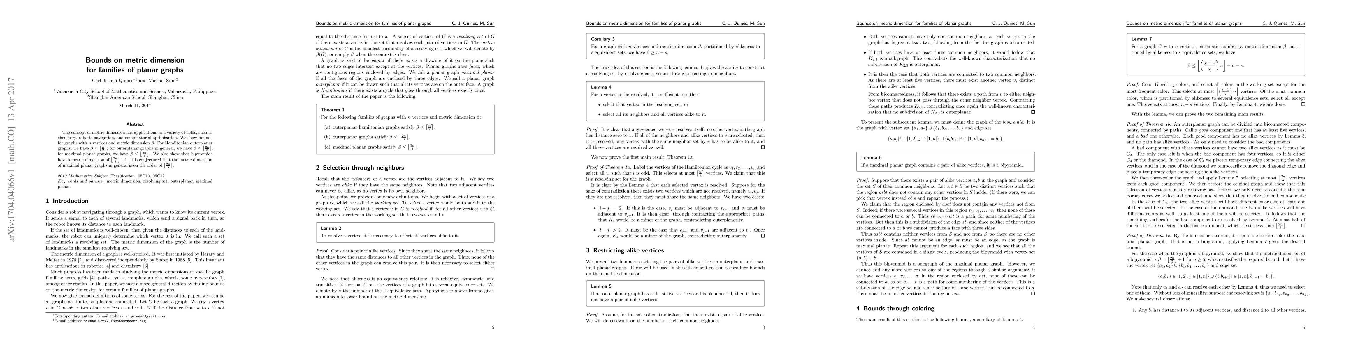 This paper provides bounds on the metric dimension for several families of planar graphs, including Hamiltonian outerplanar, general outerplanar, maximal planar, and bipyramids. The metric dimension is defined as the minimum number of vertices needed to uniquely identify all other vertices in the graph.