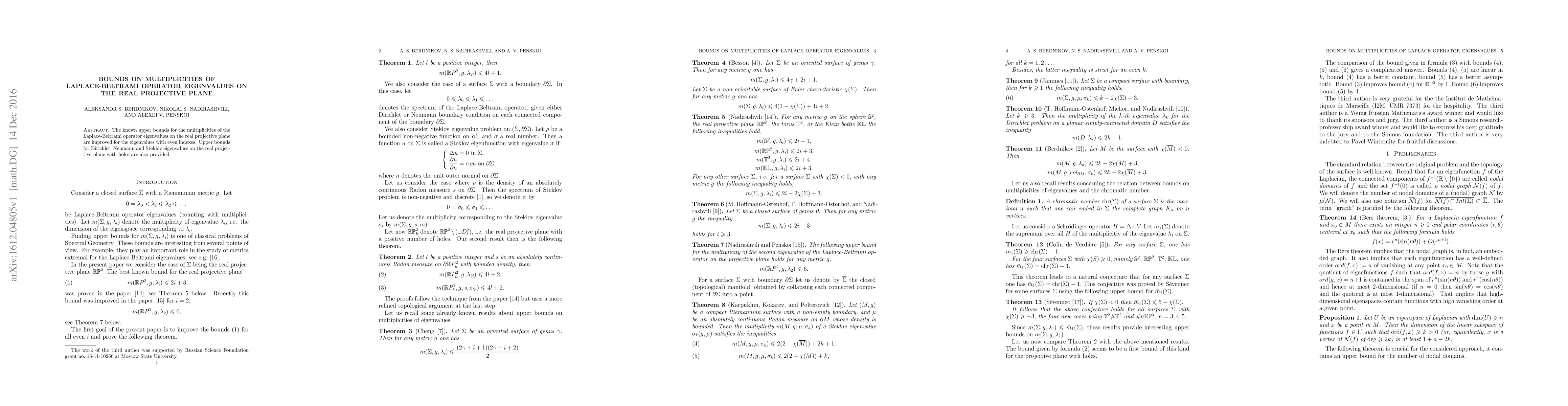 This paper improves the upper bounds on the multiplicities of Laplace-Beltrami operator eigenvalues on the real projective plane, particularly for even-index eigenvalues. It also establishes new upper bounds for Dirichlet, Neumann, and Steklov eigenvalues on the real projective plane with holes.