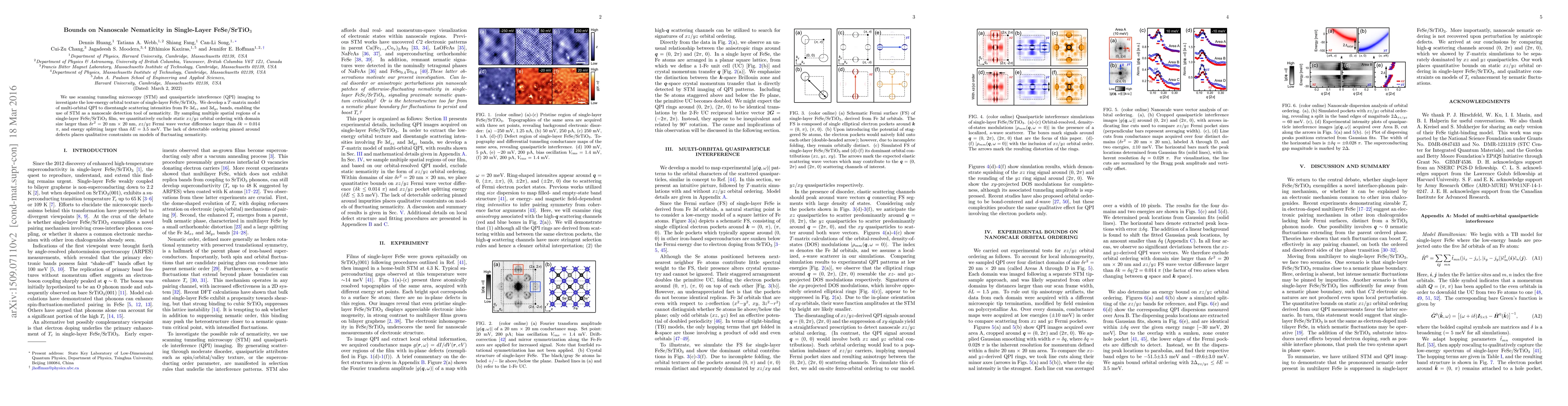 We use scanning tunneling microscopy (STM) and quasiparticle interference (QPI) imaging to investigate the low-energy orbital texture of single-layer FeSe/SrTiO$_3$. We develop a $T$-matrix model of multi-orbital QPI to disentangle scattering intensities from Fe $3d_{xz}$ and $3d_{yz}$ bands, enabling the use of STM as a nanoscale detection tool of nematicity. By sampling multiple spatial regions of a single-layer FeSe/SrTiO$_3$ film, we quantitatively exclude static $xz/yz$ orbital ordering with domain size larger than $\delta r^2$ = 20 nm $\times$ 20 nm, $xz/yz$ Fermi wave vector difference larger than $\delta k$ = 0.014 $\pi$, and energy splitting larger than $\delta E$ = 3.5 meV. The lack of detectable ordering pinned around defects places qualitative constraints on models of fluctuating nematicity.