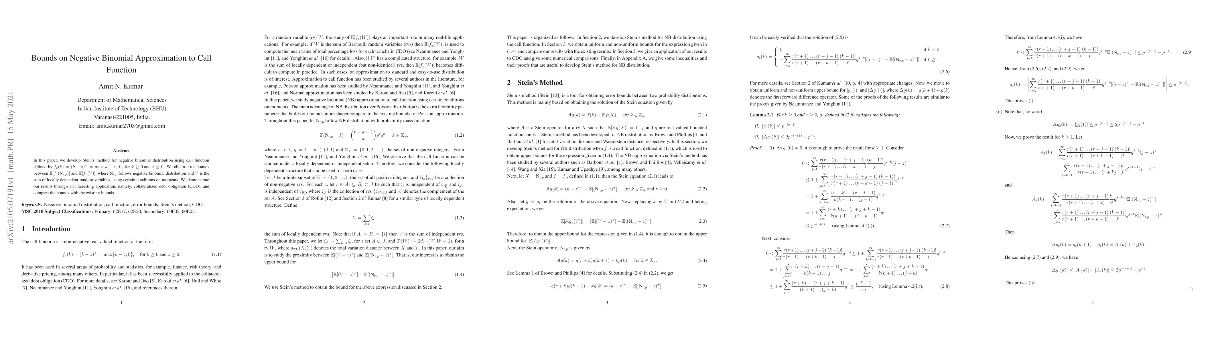 In this paper, we develop Stein's method for negative binomial distribution using call function defined by $f_z(k)=(k-z)^+=\max\{k-z,0\}$, for $k\ge 0$ and $z \ge 0$. We obtain error bounds between $\mathbb{E}[f_z(\text{N}_{r,p})]$ and $\mathbb{E}[f_z(V)]$, where $\text{N}_{r,p}$ follows negative binomial distribution and $V$ is the sum of locally dependent random variables, using certain conditions on moments. We demonstrate our results through an interesting application, namely, collateralized debt obligation (CDO), and compare the bounds with the existing bounds.