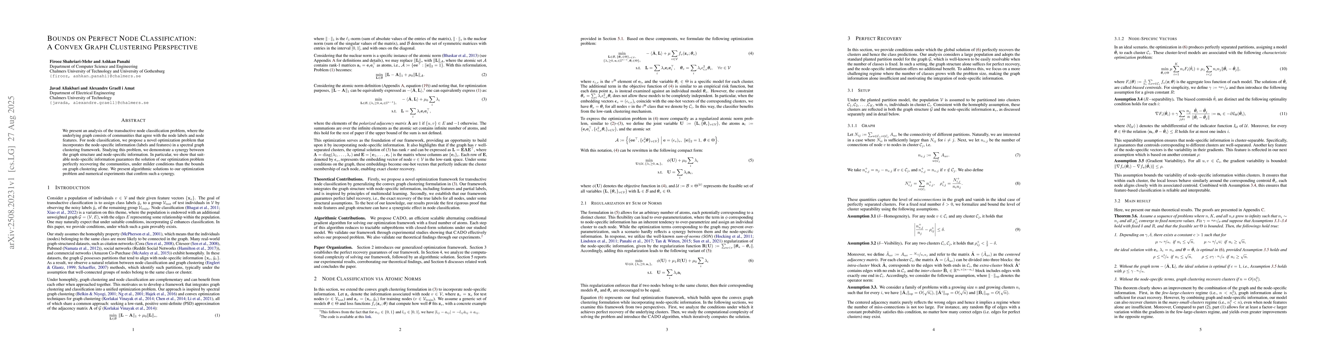 We present an analysis of the transductive node classification problem, where the underlying graph consists of communities that agree with the node labels and node features. For node classification, we propose a novel optimization problem that incorporates the node-specific information (labels and features) in a spectral graph clustering framework. Studying this problem, we demonstrate a synergy between the graph structure and node-specific information. In particular, we show that suitable node-specific information guarantees the solution of our optimization problem perfectly recovering the communities, under milder conditions than the bounds on graph clustering alone. We present algorithmic solutions to our optimization problem and numerical experiments that confirm such a synergy.