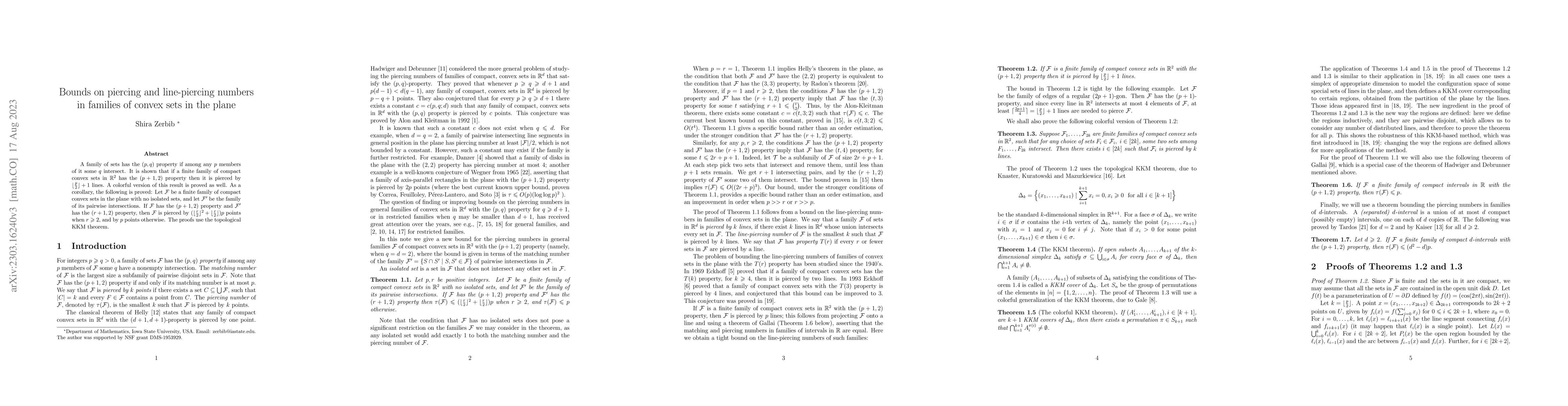 This paper establishes bounds on the piercing and line-piercing numbers for families of convex sets in the plane, showing that certain properties lead to specific piercing results. It also proves a colorful version and a corollary regarding the number of points required to pierce such families, utilizing the topological KKM theorem in its proofs.