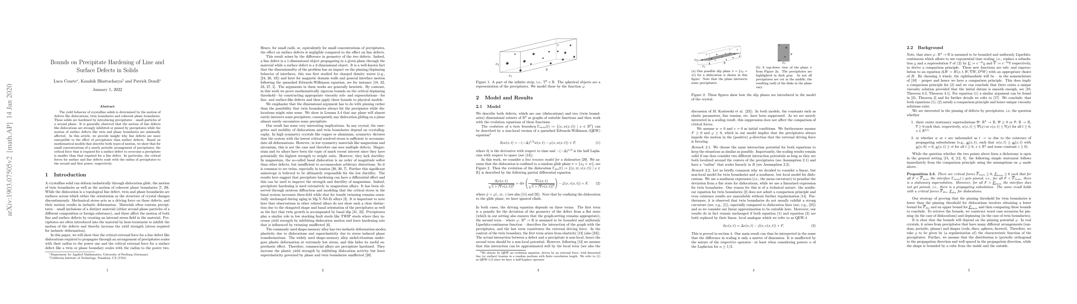 This paper examines the interaction of precipitates with line and surface defects in crystalline solids, demonstrating that line defects (dislocations) are more strongly inhibited by precipitates than surface defects (twin and phase boundaries). The study reveals that critical forces for overcoming these defects scale differently, with surface defects requiring less force due to a precipitate radius scaling relationship.