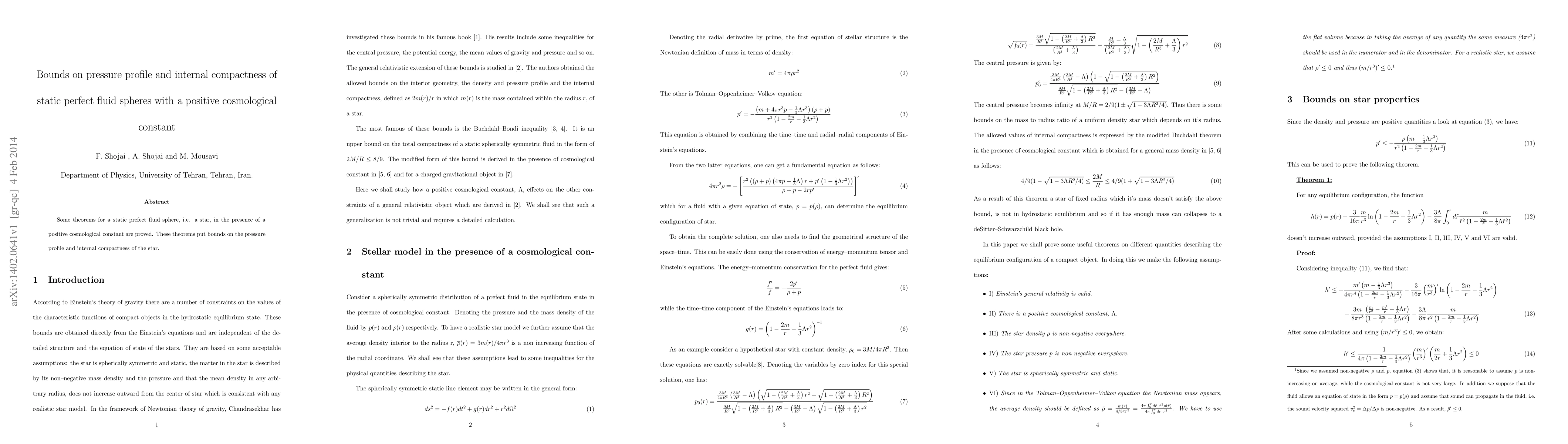 Some theorems for a static prefect fluid sphere, i.e. a star, in the presence of a positive cosmological constant are proved. These theorems put bounds on the pressure profile and internal compactness of the star.