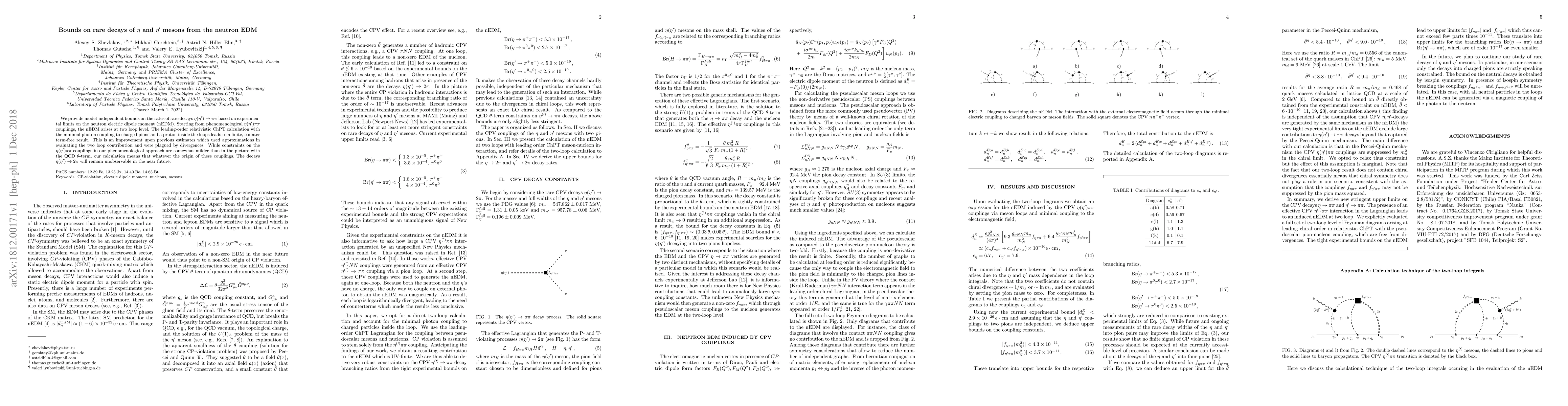 We provide model-independent bounds on the rates of rare decays $\eta (\eta^\prime) \to \pi\pi$ based on experimental limits on the neutron electric dipole moment (nEDM). Starting from phenomenological $\eta(\eta^\prime) \pi\pi$ couplings, the nEDM arises at two loop level. The leading-order relativistic ChPT calculation with the minimal photon coupling to charged pions and a proton inside the loops leads to a finite, counter term-free result. This is an improvement upon previous estimates which used approximations in evaluating the two loop contribution and were plagued by divergences. While constraints on the $\eta(\eta^\prime) \pi\pi$ couplings in our phenomenological approach are somewhat milder than in the picture with the QCD $\theta$-term, our calculation means that whatever the origin of these couplings, The decays $\eta (\eta') \to 2 \pi$ will remain unobservable in the near future.