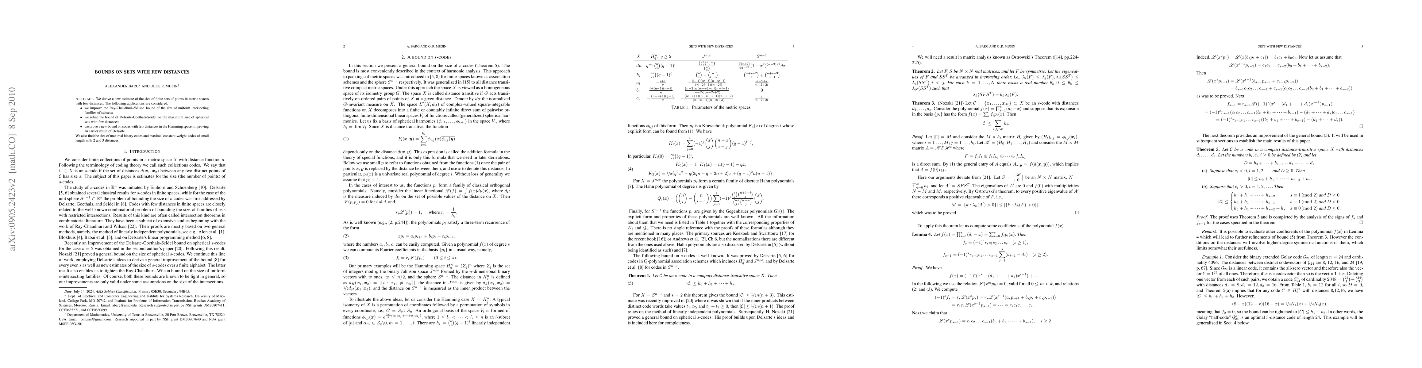 This paper establishes new estimates for the size of finite point sets in metric spaces characterized by having few distinct distances. It improves several existing bounds in combinatorial geometry and coding theory, including the Ray-Chaudhuri-Wilson bound for intersecting families, the Delsarte-Goethals-Seidel bound for spherical sets, and Delsarte's bound for Hamming space codes. Additionally, it determines the size of maximal binary codes and constant-weight codes with limited distance constraints.