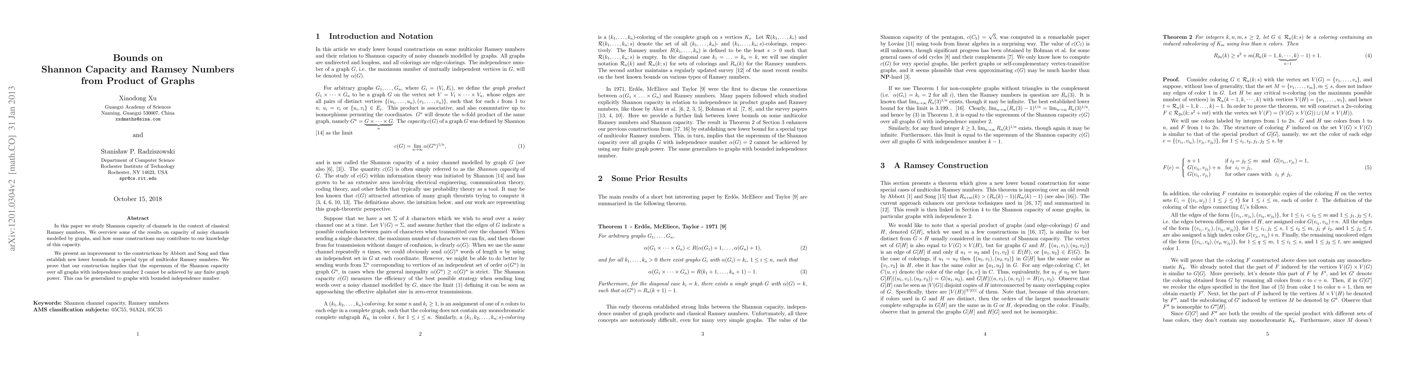 The paper studies Shannon capacity of channels in the context of classical Ramsey numbers, improving upon previous constructions by Abbott and Song to establish new lower bounds for multicolor Ramsey numbers and linking these to Shannon capacity.