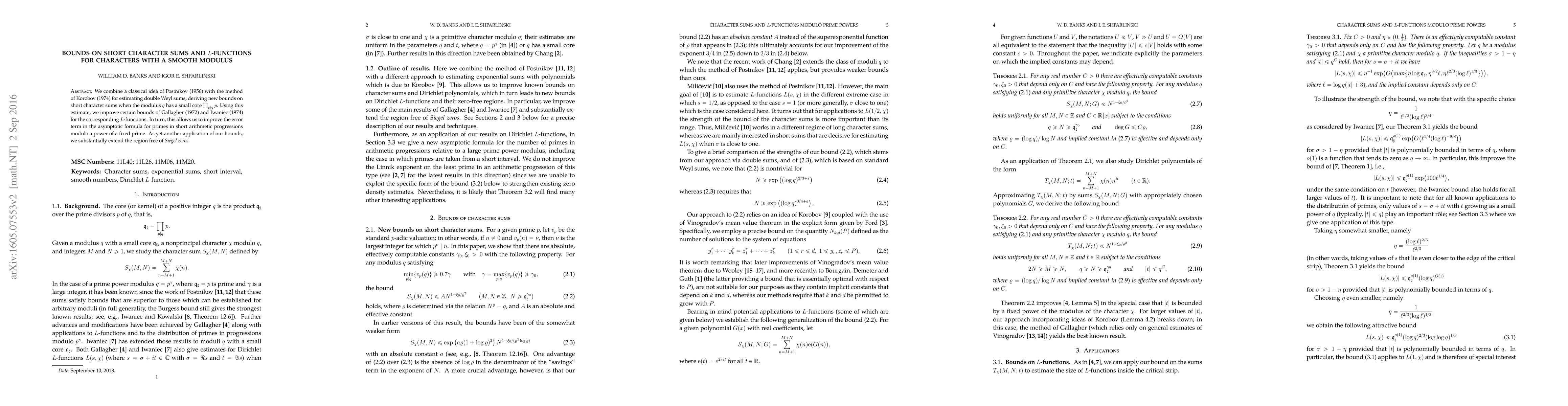 We combine a classical idea of Postnikov (1956) with the method of Korobov (1974) for estimating double Weyl sums, deriving new bounds on short character sums when the modulus $q$ has a small core $\prod_{p\mid q}p$. Using this estimate, we improve certain bounds of Gallagher (1972) and Iwaniec (1974) for the corresponding $L$-functions. In turn, this allows us to improve the error term in the asymptotic formula for primes in short arithmetic progressions modulo a power of a fixed prime. As yet another application of our bounds, we substantially extend the region free of Siegel zeros.