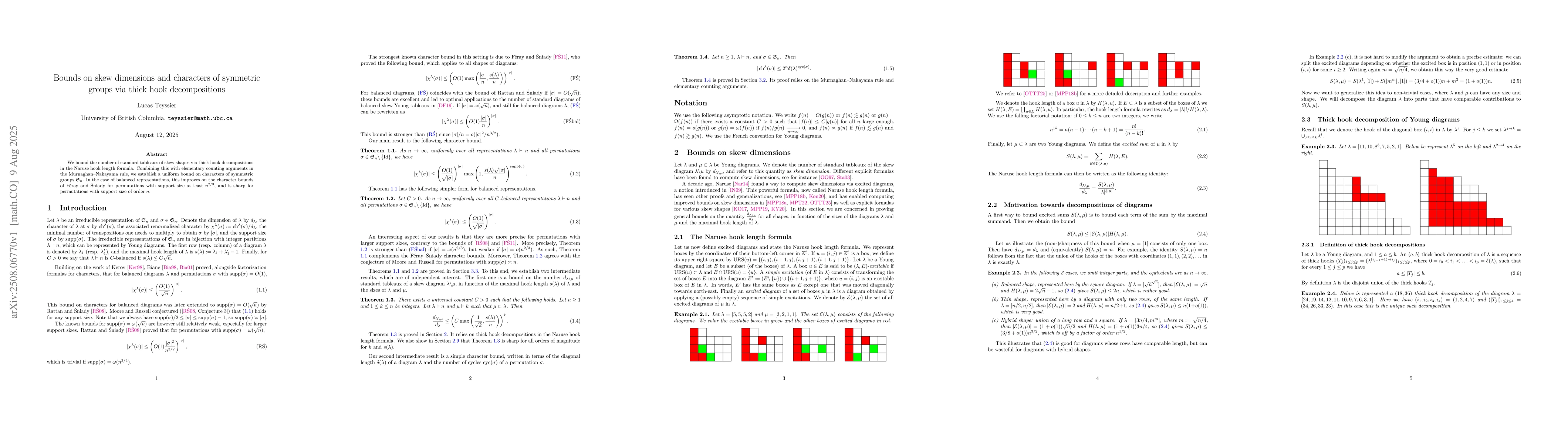 We bound the number of standard tableaux of skew shapes via thick hook decompositions in the Naruse hook length formula. Combining this with elementary counting arguments in the Murnaghan--Nakayama rule, we establish a uniform bound on characters of symmetric groups $\mathfrak{S}_n$. In the case of balanced representations, this improves on the character bounds of F\'eray and \'Sniady for permutations with support size at least $n^{2/3}$, and is sharp for permutations with support size of order $n$.