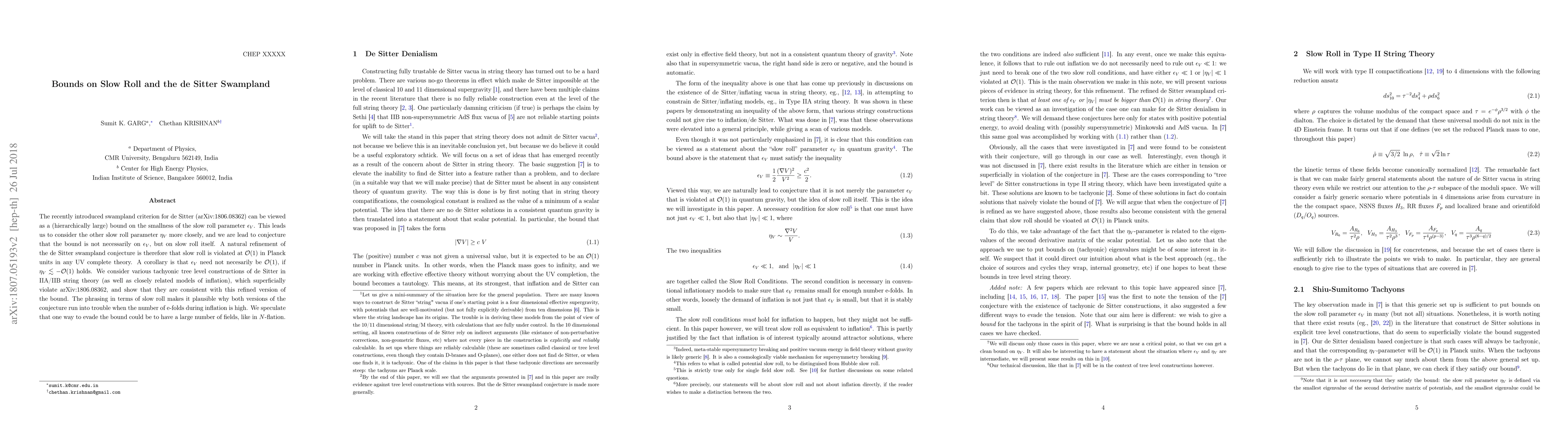 The recently introduced swampland criterion for de Sitter (arXiv:1806.08362) can be viewed as a (hierarchically large) bound on the smallness of the slow roll parameter $\epsilon_V$. This leads us to consider the other slow roll parameter $\eta_V$ more closely, and we are lead to conjecture that the bound is not necessarily on $\epsilon_V$, but on slow roll itself. A natural refinement of the de Sitter swampland conjecture is therefore that slow roll is violated at ${\cal O}(1)$ in Planck units in any UV complete theory. A corollary is that $\epsilon_V$ need not necessarily be ${\cal O}(1)$, if $\eta_V \lesssim -{\cal O}(1)$ holds. We consider various tachyonic tree level constructions of de Sitter in IIA/IIB string theory (as well as closely related models of inflation), which superficially violate arXiv:1806.08362, and show that they are consistent with this refined version of the bound. The phrasing in terms of slow roll makes it plausible why both versions of the conjecture run into trouble when the number of e-folds during inflation is high. We speculate that one way to evade the bound could be to have a large number of fields, like in $N$-flation.