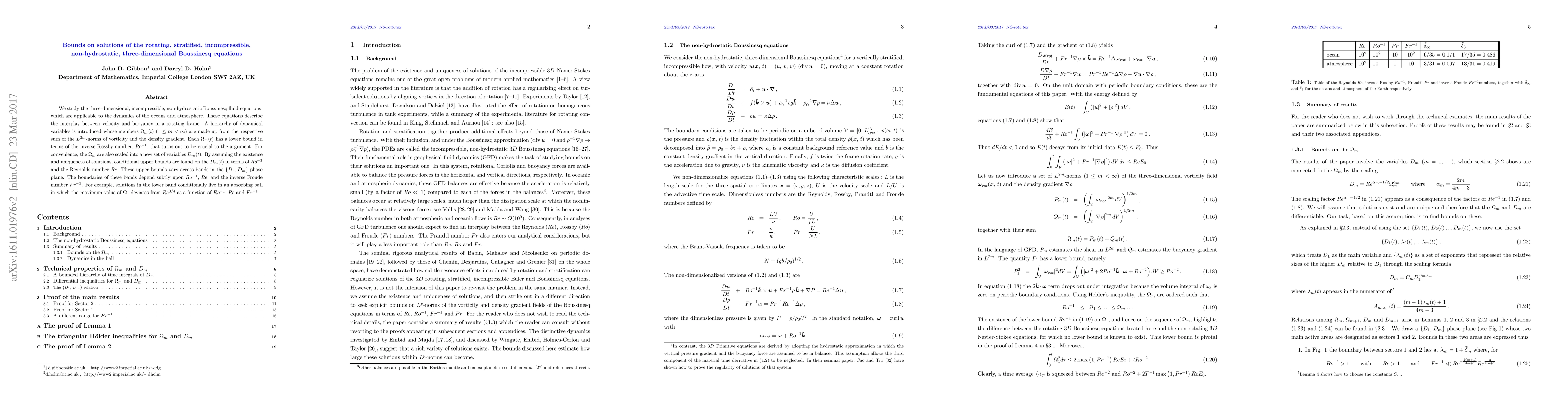 The paper establishes bounds on solutions to the rotating Boussinesq equations for ocean and atmosphere dynamics, showing how velocity and buoyancy interact in a rotating frame, with conditions depending on the Rossby number, Reynolds number, and Froude number.