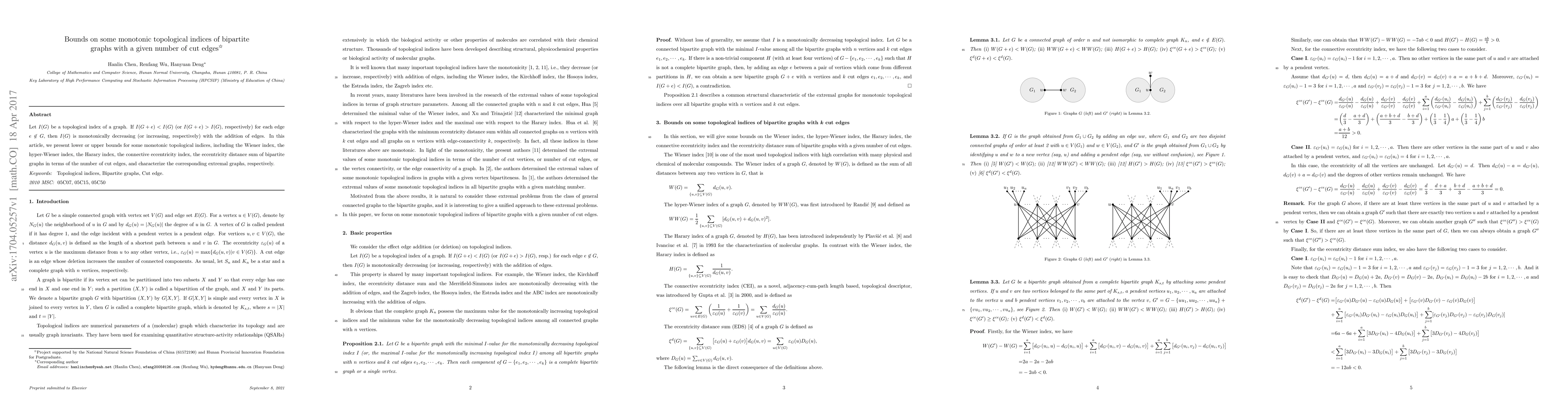 Let $I(G)$ be a topological index of a graph. If $I(G+e)I(G)$, respectively) for each edge $e\not\in G$, then $I(G)$ is monotonically decreasing (or increasing, respectively) with the addition of edges. In this article, we present lower or upper bounds for some monotonic topological indices, including the Wiener index, the hyper-Wiener index, the Harary index, the connective eccentricity index, the eccentricity distance sum of bipartite graphs in terms of the number of cut edges, and characterize the corresponding extremal graphs, respectively.