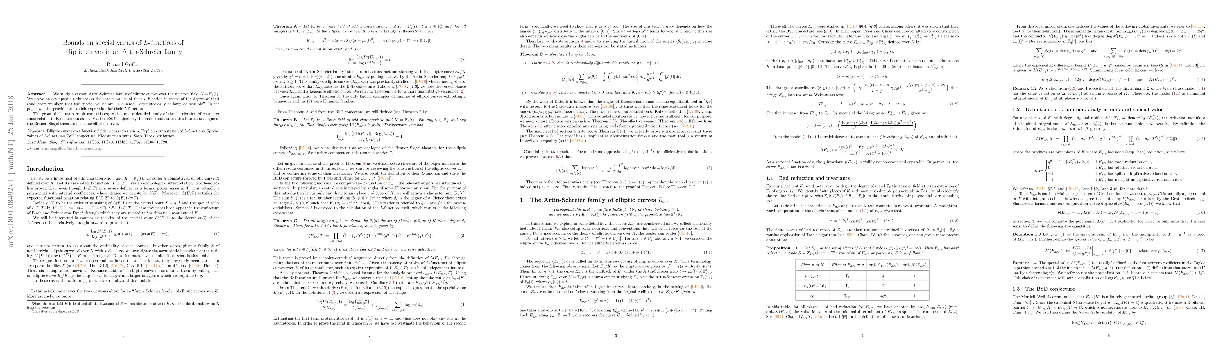 This paper investigates an Artin-Schreier family of elliptic curves over $\mathbb{F}_q(t)$ and establishes an asymptotic bound on their $L$-function's special values, showing they are "asymptotically as large as possible." It also derives an explicit $L$-function expression and applies it to prove an analogue of the Brauer-Siegel theorem.