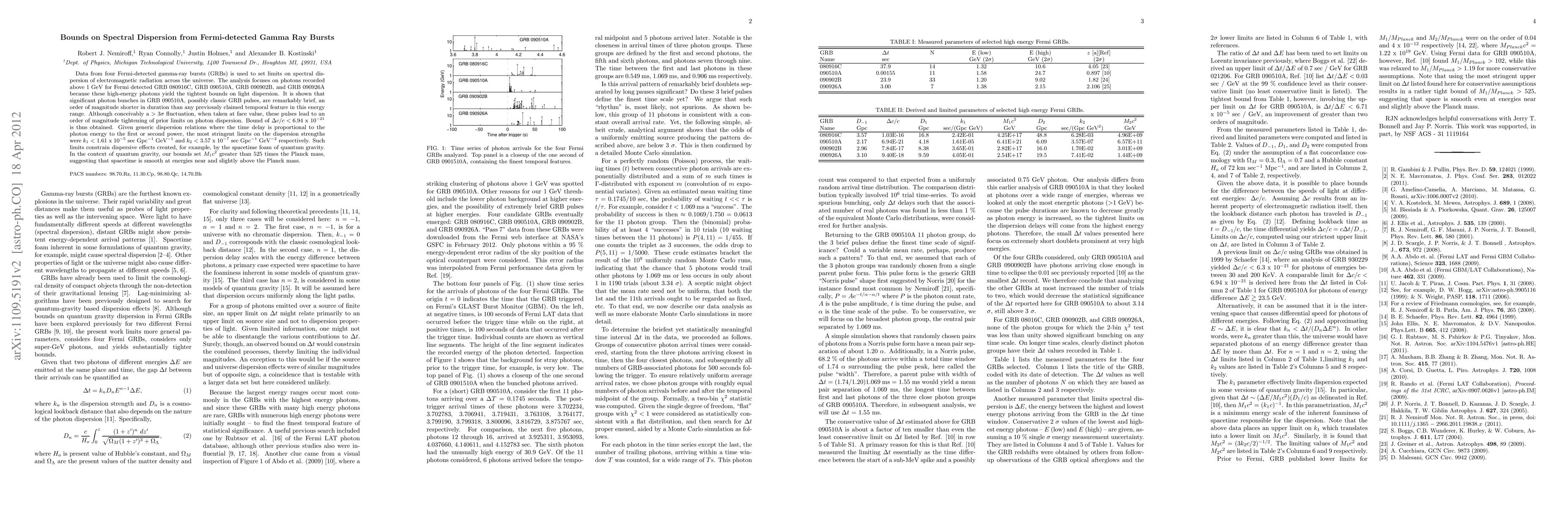 This paper sets new limits on the spectral dispersion of electromagnetic radiation from four Fermi-detected gamma-ray bursts, achieving an order of magnitude improvement over previous bounds. The analysis reveals brief, significant photon bunches in GRB 090510A, leading to the most stringent limits on dispersion strengths and constraints on quantum gravity effects.
