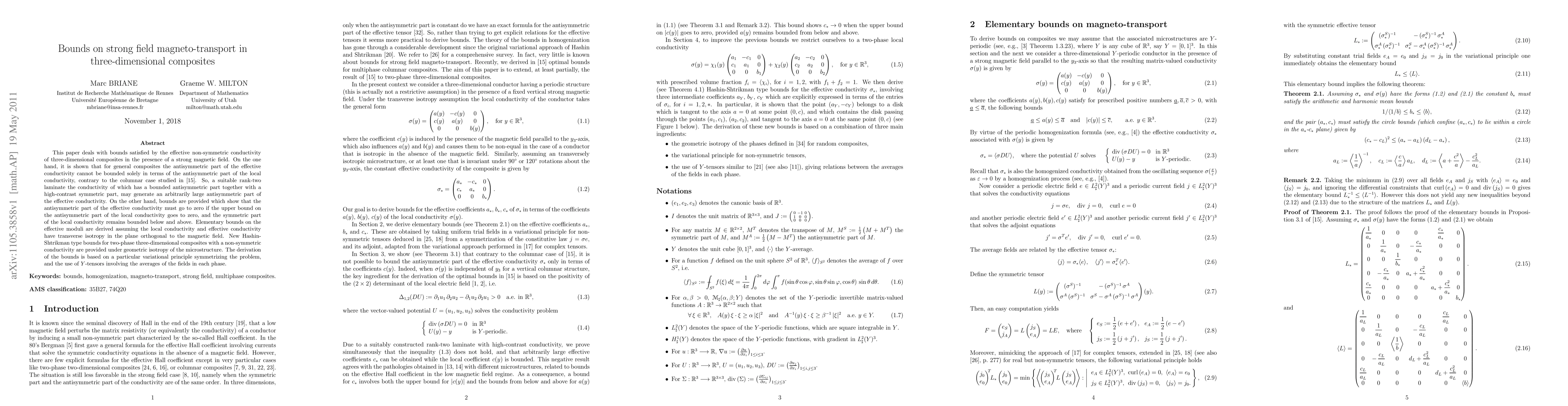 This paper establishes bounds on the effective non-symmetric conductivity of three-dimensional composites under strong magnetic fields, showing that the antisymmetric part of effective conductivity cannot be solely bounded by local conductivity. It also provides new Hashin-Shtrikman type bounds under geometric isotropy, derived via variational principles and Y-tensors.