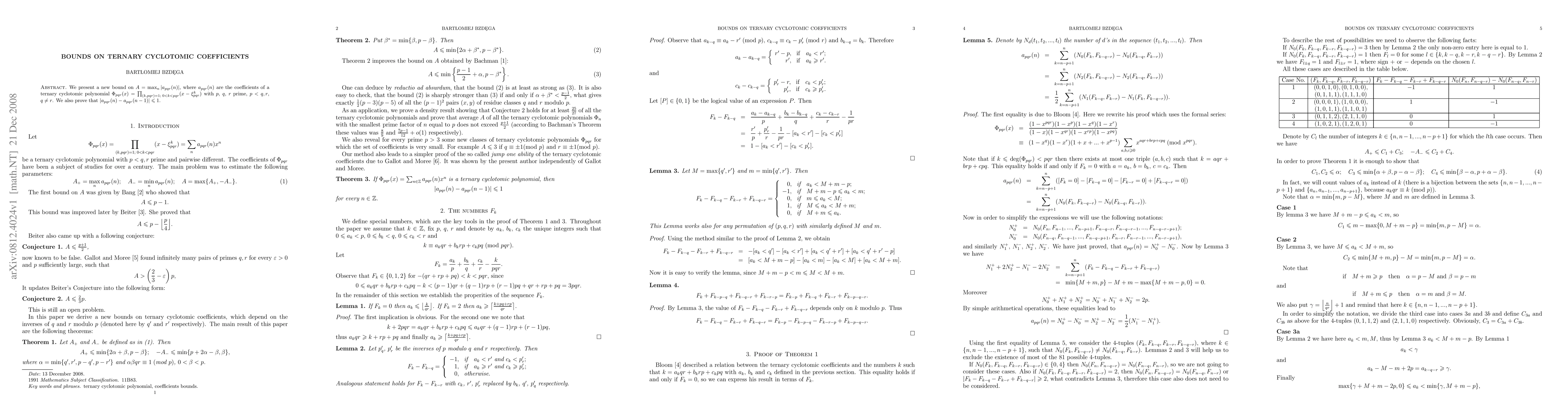 We present a new bound on $A = \max_n |a_{pqr}(n)|$, where $a_{pqr}(n)$ are the coefficients of a ternary cyclotomic polynomial. We also prove that two consecutive coefficients of such a polynomial differ by at most one.