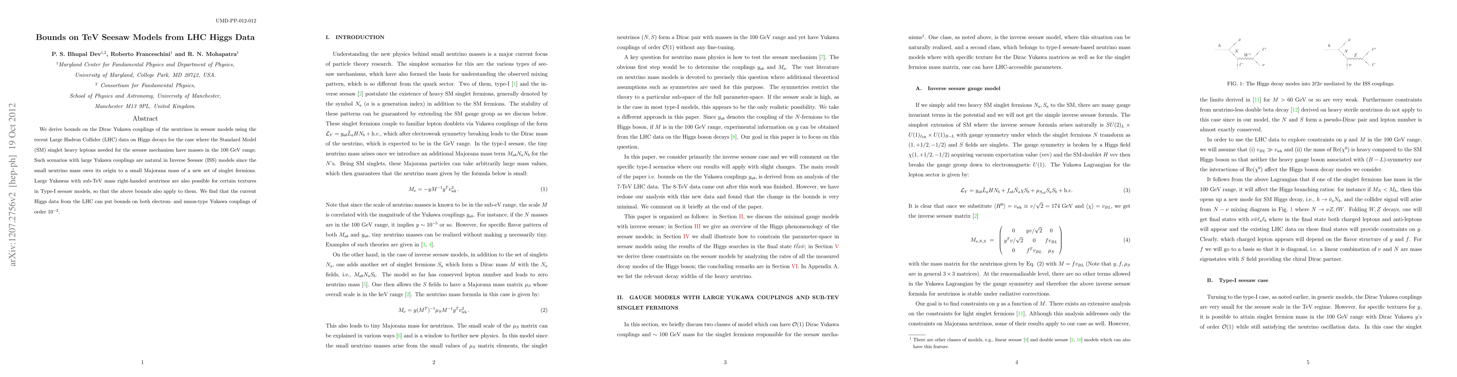 We derive bounds on the Dirac Yukawa couplings of the neutrinos in seesaw models using the recent Large Hadron Collider (LHC) data on Higgs decays for the case where the Standard Model singlet heavy leptons needed for the seesaw mechanism have masses in the 100 GeV range. Such scenarios with large Yukawa couplings are natural in Inverse Seesaw models since the small neutrino mass owes its origin to a small Majorana mass of a new set of singlet fermions. Large Yukawas with sub-TeV mass right-handed neutrinos are also possible for certain textures in Type-I seesaw models, so that the above bounds also apply to them. We find that the current Higgs data from the LHC can put bounds on both electron- and muon-type Yukawa couplings of order 10^{-2}.