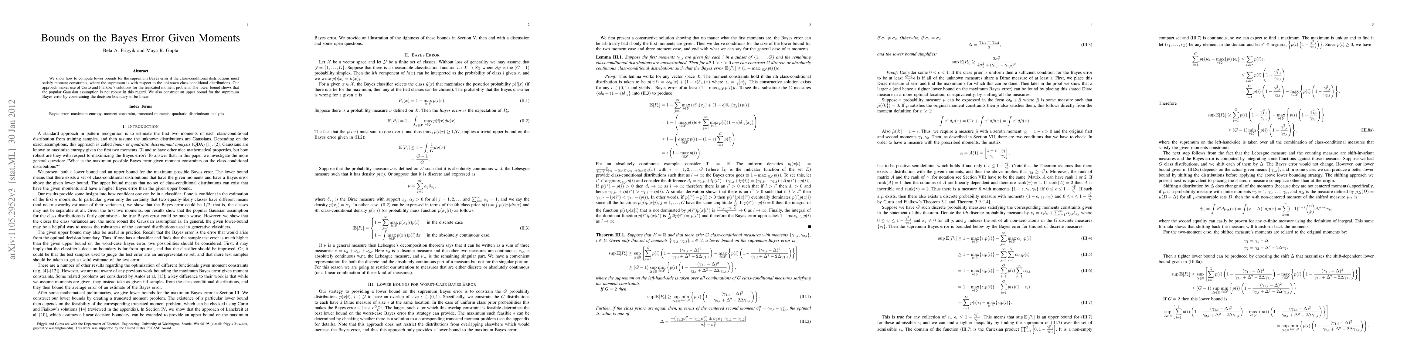 This paper develops lower bounds for the supremum Bayes error under moment constraints on class-conditional distributions, utilizing Curto and Fialkow's truncated moment problem solutions. It demonstrates that the Gaussian assumption is not robust and provides an upper bound by limiting the decision boundary to linearity.