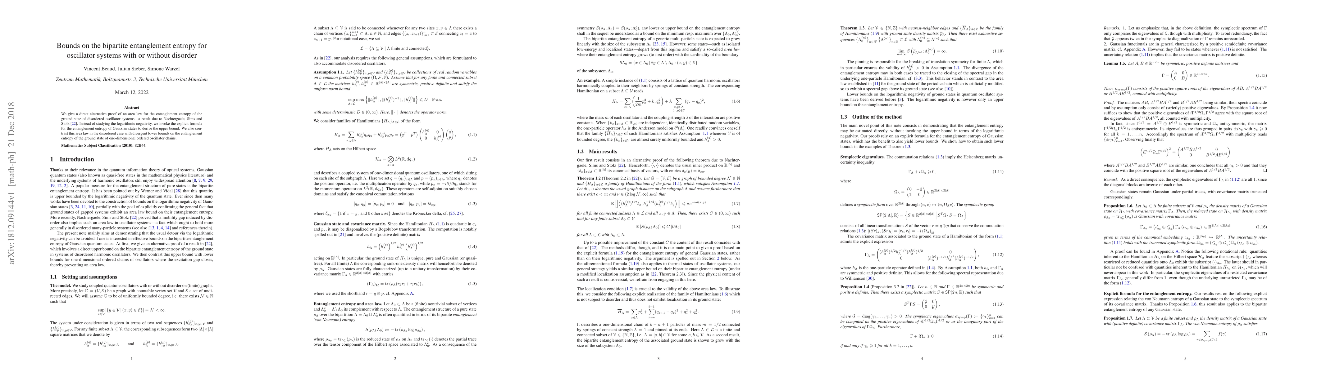 This paper provides an alternative proof of the area law for the entanglement entropy in disordered oscillator systems, using Gaussian state formulas instead of logarithmic negativity. It contrasts the area law in disordered systems with divergent lower bounds found in ordered oscillator chains.