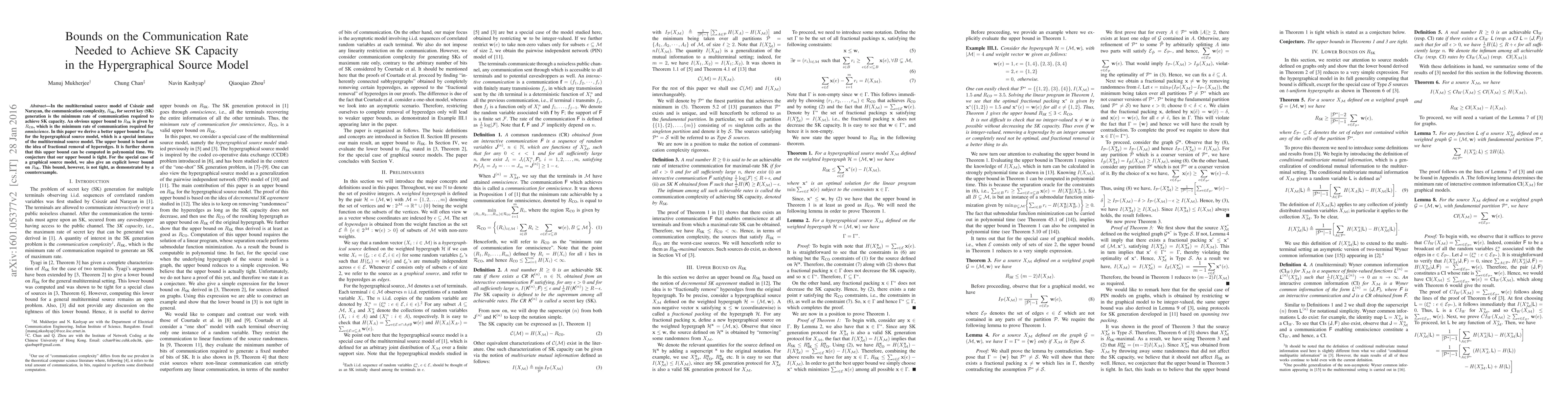 Researchers derive a better upper bound on the minimum rate of communication needed to achieve secret key capacity in the hypergraphical source model, which is a special instance of the multiterminal source model.
