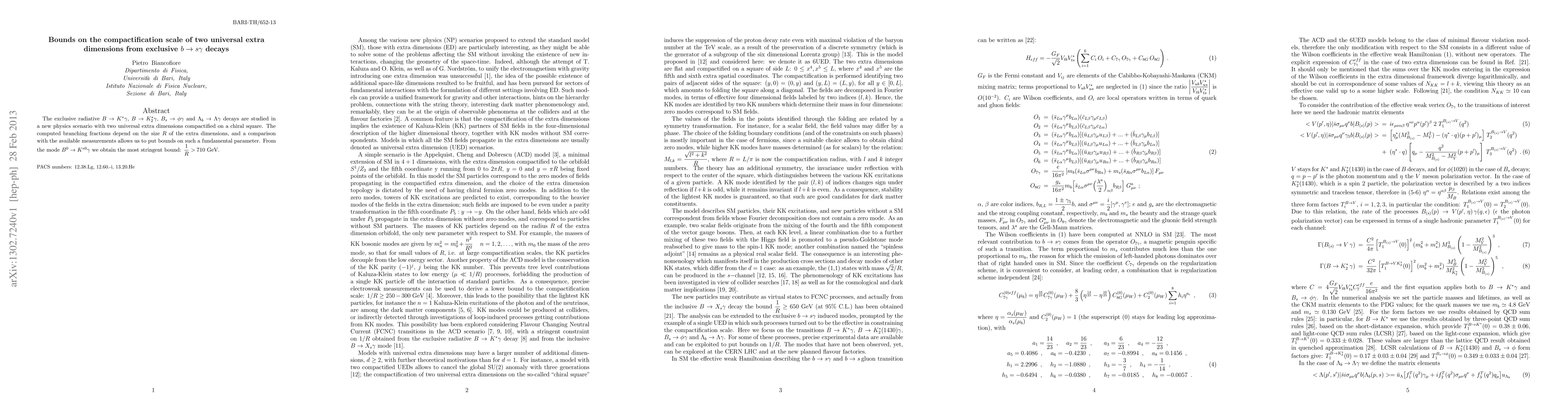 The exclusive radiative $B \to K^* \gamma$, $B \to K^*_2 \gamma$, $B_s \to \phi \gamma$ and $\Lambda_b \to \Lambda \gamma$ decays are studied in a new physics scenario with two universal extra dimensions compactified on a chiral square. The computed branching fractions depend on the size $R$ of the extra dimensions, and a comparison with the available measurements allows us to put bounds on such a fundamental parameter. From the mode $B^0 \to K^{*0} \gamma$ we obtain the most stringent bound: $1 \over R>710$ GeV.
