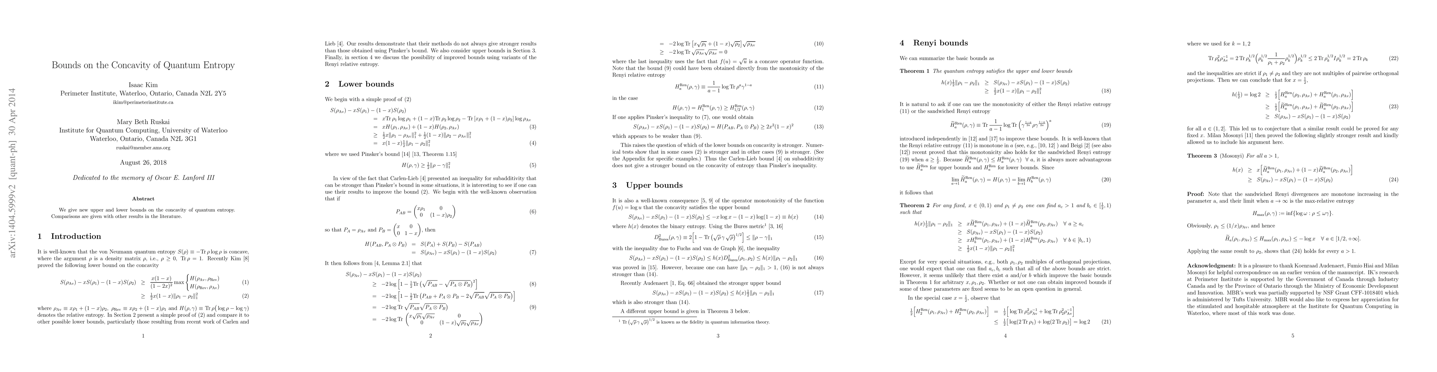 Summary: This paper presents novel upper and lower bounds on the concavity of quantum entropy, offering a refined understanding of its properties and comparing these bounds with existing literature findings.