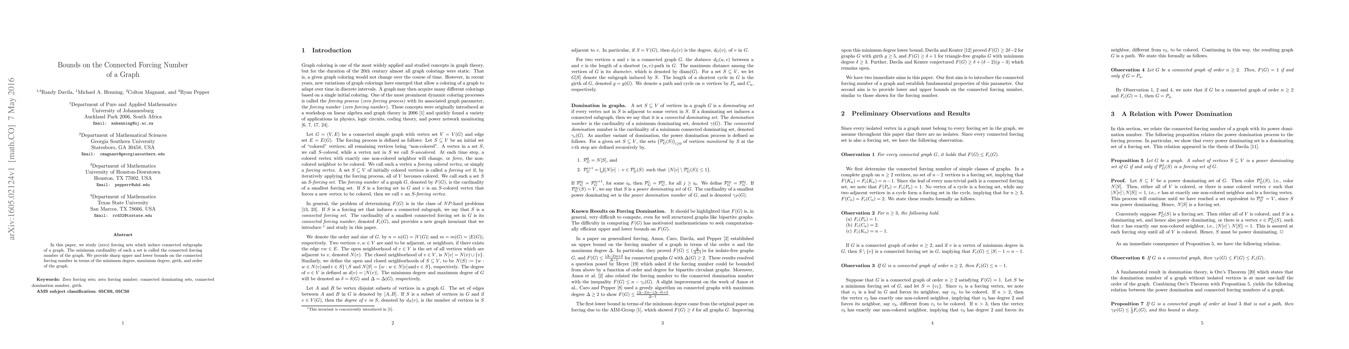This paper investigates the connected forcing number of a graph, defined as the minimum size of a set inducing connected subgraphs. It establishes precise upper and lower bounds for this number based on the graph's minimum degree, maximum degree, girth, and order.