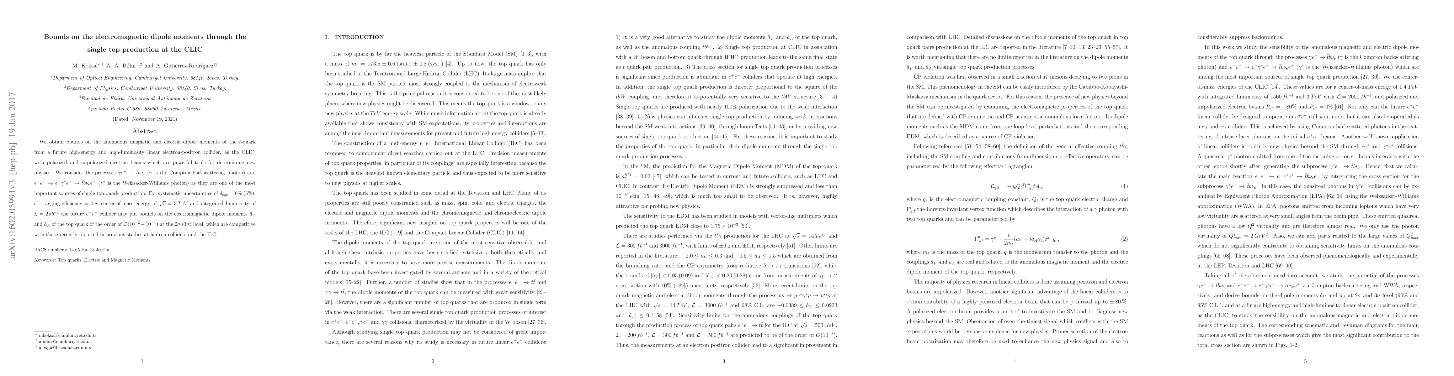 This paper investigates the potential of the CLIC collider to determine bounds on the anomalous magnetic and electric dipole moments of the $t$-quark through single top production processes. The study finds that the CLIC may achieve competitive limits on the electromagnetic dipole moments of the top quark, $\hat a_V$ and $\hat a_A$, of the order ${\cal O}(10^{-2}-10^{-1})$.