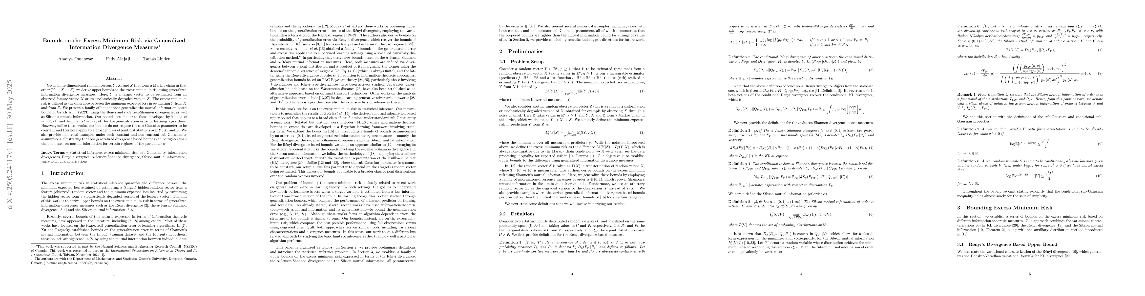 The research derives upper bounds on the excess minimum risk using generalized information divergence measures for a Markov chain Y -> X -> Z, where Y is the target, X is the observed feature, and Z is a degraded version of X. It generalizes mutual information-based bounds using Rényi and α-Jensen-Shannon divergences, Sibson's mutual information, and applies to a broader class of joint distributions without constant sub-Gaussian parameter assumptions.