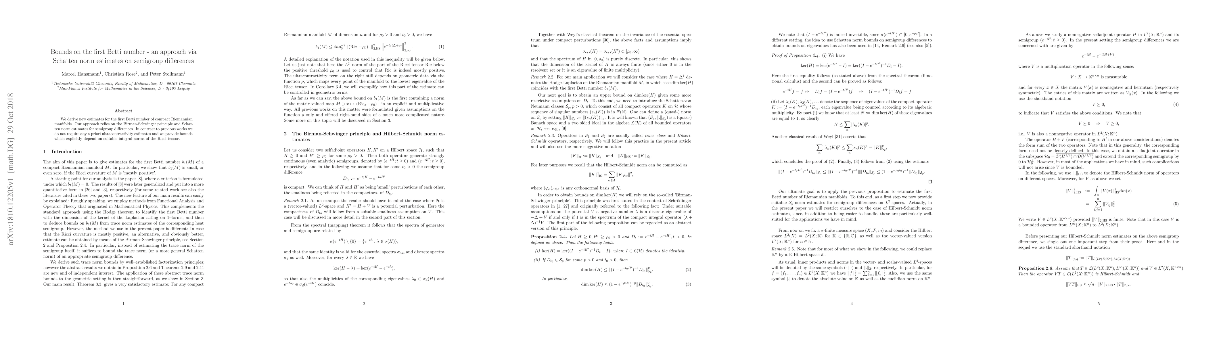 This research derives novel bounds for the first Betti number of compact Riemannian manifolds, utilizing the Birman-Schwinger principle and Schatten norm estimates for semigroup differences. Unlike prior methods, it doesn't necessitate ultracontractivity assumptions and provides bounds directly related to integral norms of the Ricci tensor.