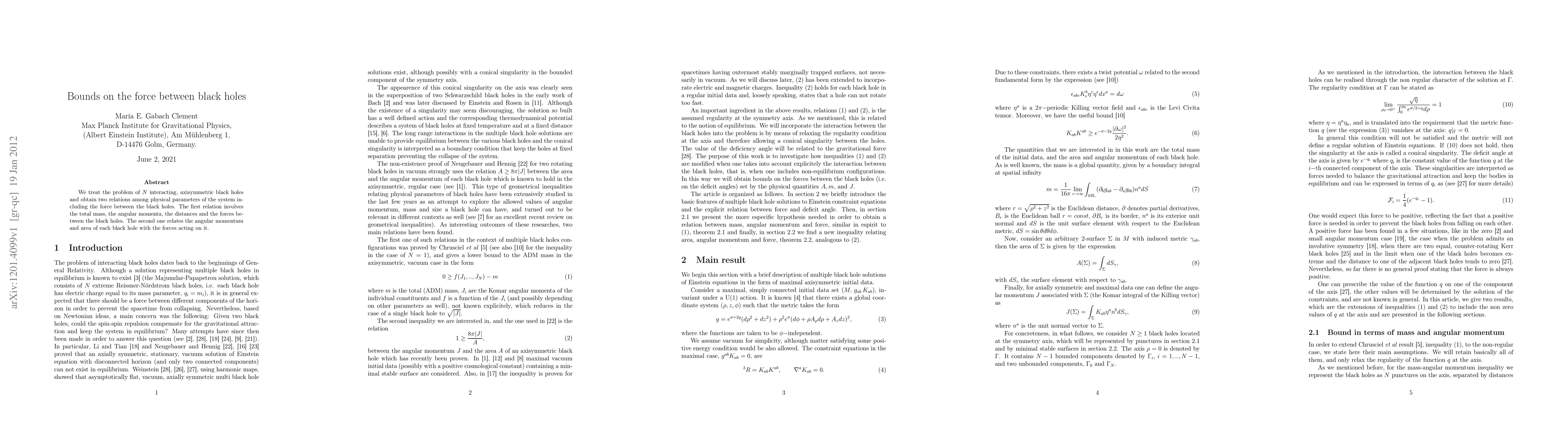 We treat the problem of N interacting, axisymmetric black holes and obtain two relations among physical parameters of the system including the force between the black holes. The first relation involves the total mass, the angular momenta, the distances and the forces between the black holes. The second one relates the angular momentum and area of each black hole with the forces acting on it.