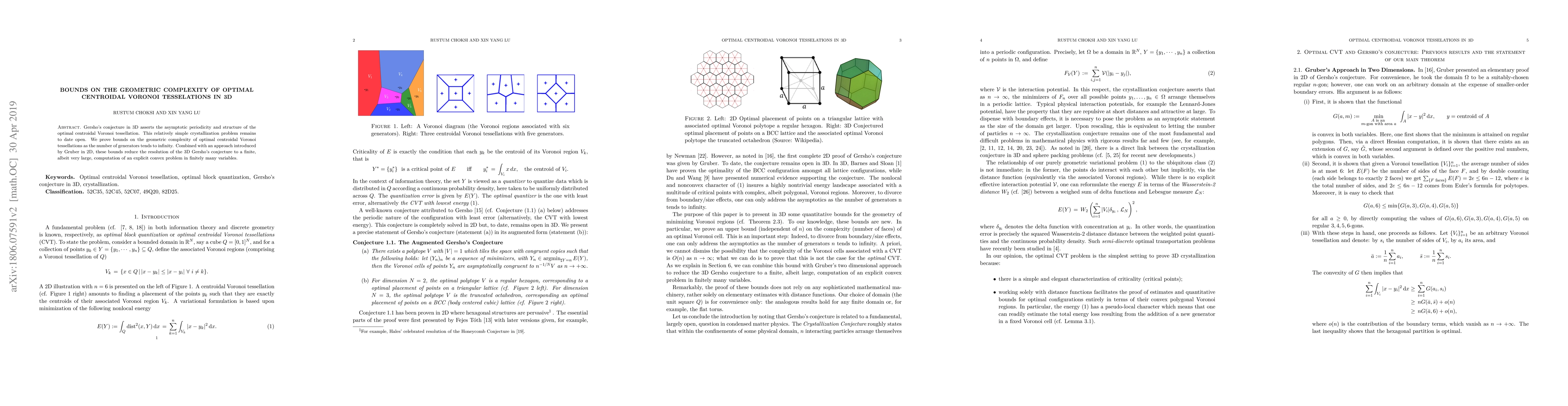 This paper proves bounds on the geometric complexity of 3D optimal centroidal Voronoi tessellations, supporting Gersho's conjecture on their asymptotic periodicity. The approach reduces the conjecture's resolution to a finite computation of an explicit convex problem.