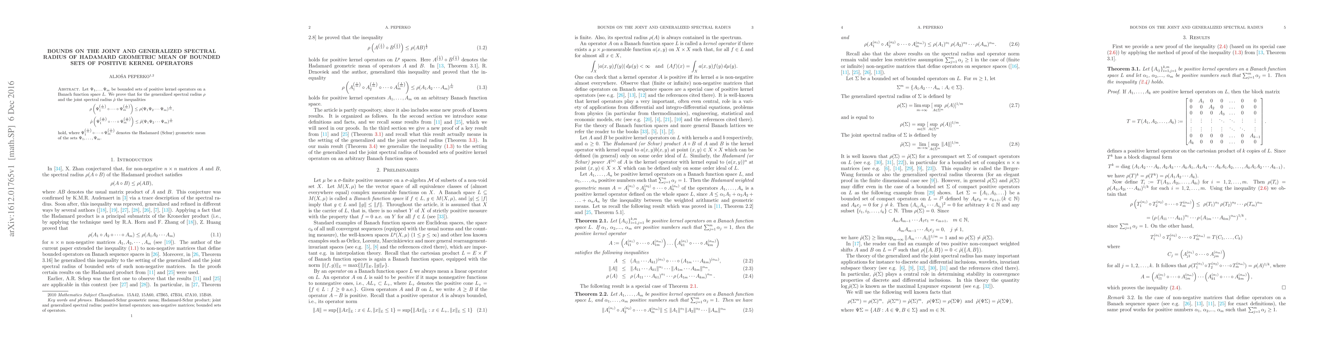 Let $\Psi _1, \ldots \Psi _m$ be bounded sets of positive kernel operators on a Banach function space $L$. We prove that for the generalized spectral radius $\rho$ and the joint spectral radius $\hat{\rho}$ the inequalities $$\rho \left(\Psi _1 ^{\left( \frac{1}{m} \right)} \circ \cdots \circ \Psi _m ^{\left( \frac{1}{m} \right)} \right) \le \rho (\Psi _1 \Psi _2 \cdots \Psi _m) ^{\frac{1}{m}},$$ $$\hat{\rho} \left(\Psi _1 ^{\left( \frac{1}{m} \right)} \circ \cdots \circ \Psi _m ^{\left( \frac{1}{m} \right)} \right) \le \hat{\rho} (\Psi _1 \Psi _2 \cdots \Psi _m) ^{\frac{1}{m}}$$ hold, where $\Psi _1 ^{\left( \frac{1}{m} \right)} \circ \cdots \circ \Psi _m ^{\left( \frac{1}{m} \right)}$ denotes the Hadamard (Schur) geometric mean of the sets $\Psi _1, \ldots , \Psi _m$.