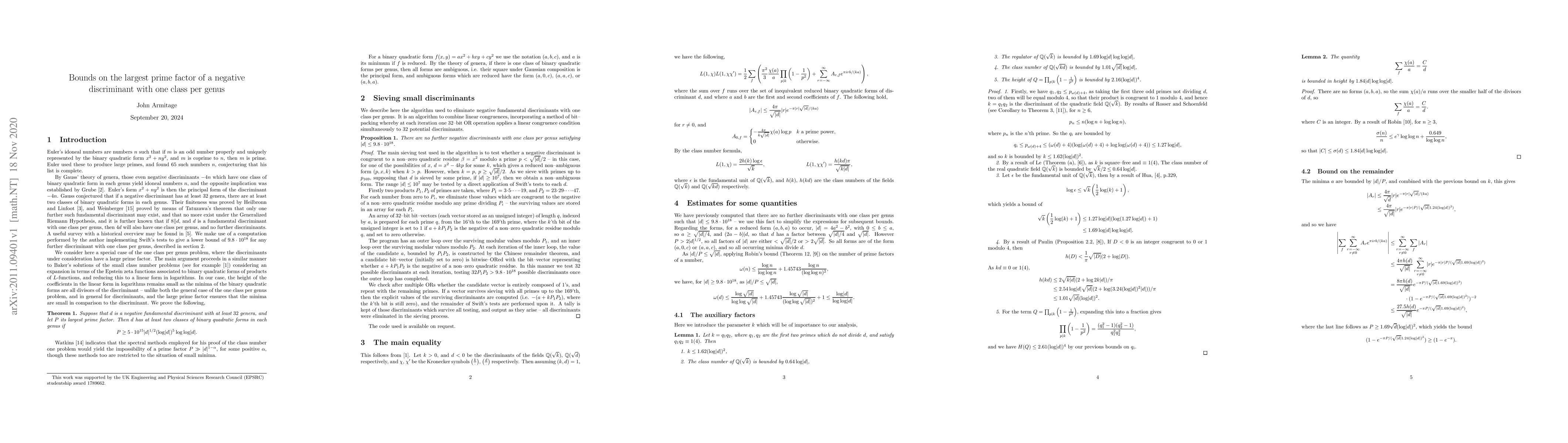 It was conjectured by Gauss that any negative discriminant with at least 32 genera has at least two classes of binary quadratic forms in each genus. We prove that such a discriminant cannot have a particularly large prime factor, by an argument similar to that of Baker's solution to Gauss' class number one problem.