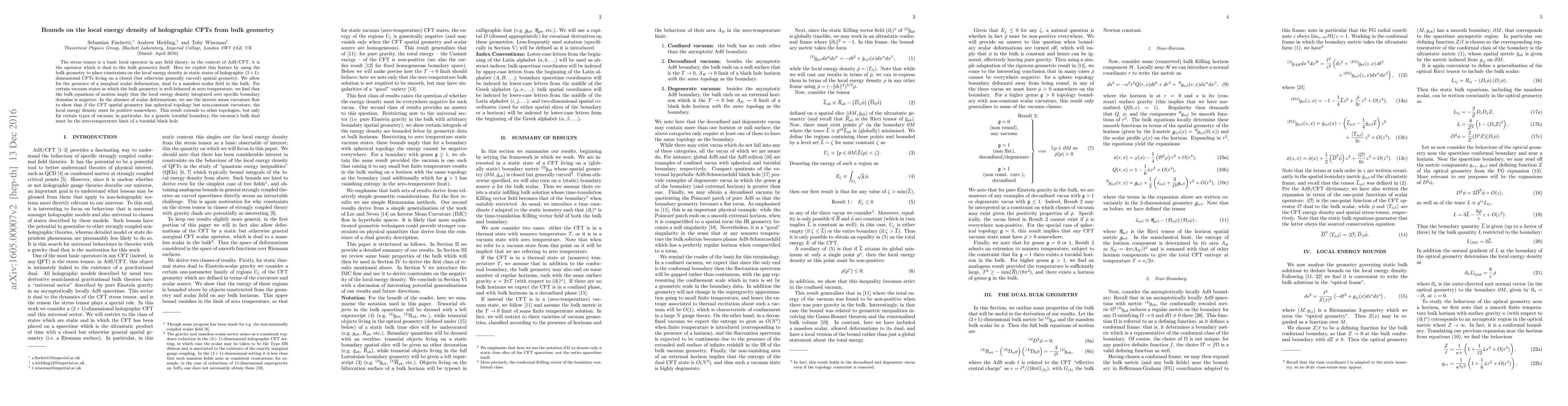 The stress tensor is a basic local operator in any field theory; in the context of AdS/CFT, it is the operator which is dual to the bulk geometry itself. Here we exploit this feature by using the bulk geometry to place constraints on the local energy density in static states of holographic $(2+1)$-dimensional CFTs living on a closed (but otherwise generally curved) spatial geometry. We allow for the presence of a marginal scalar deformation, dual to a massless scalar field in the bulk. For certain vacuum states in which the bulk geometry is well-behaved at zero temperature, we find that the bulk equations of motion imply that the local energy density integrated over specific boundary domains is negative. In the absence of scalar deformations, we use the inverse mean curvature flow to show that if the CFT spatial geometry has spherical topology but non-constant curvature, the local energy density must be positive somewhere. This result extends to other topologies, but only for certain types of vacuum; in particular, for a generic toroidal boundary, the vacuum's bulk dual must be the zero-temperature limit of a toroidal black hole.