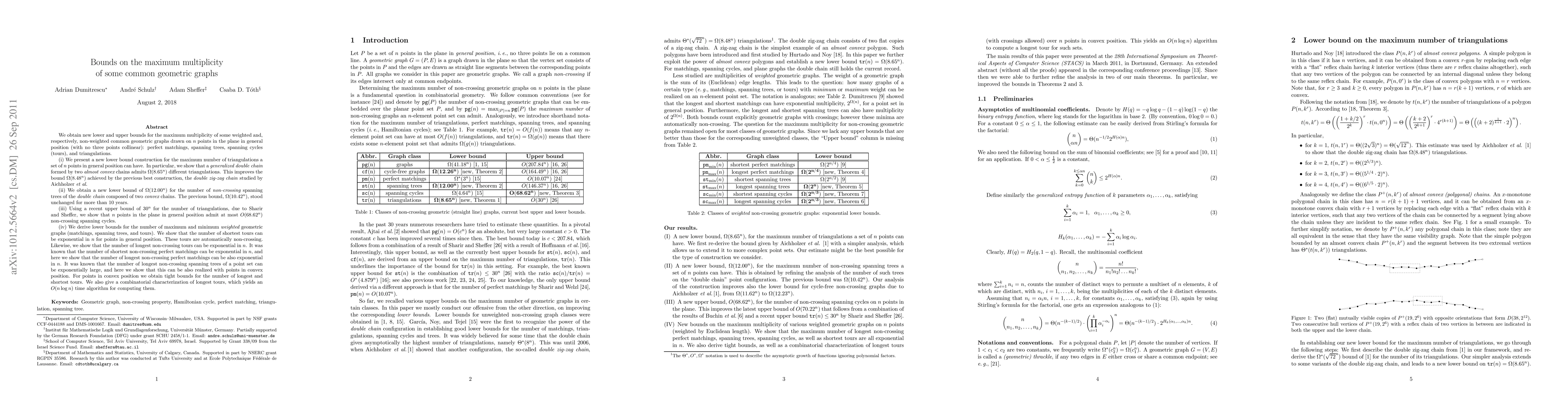 We obtain new lower and upper bounds for the maximum multiplicity of some weighted and, respectively, non-weighted common geometric graphs drawn on n points in the plane in general position (with no three points collinear): perfect matchings, spanning trees, spanning cycles (tours), and triangulations. (i) We present a new lower bound construction for the maximum number of triangulations a set of n points in general position can have. In particular, we show that a generalized double chain formed by two almost convex chains admits {\Omega}(8.65^n) different triangulations. This improves the bound {\Omega}(8.48^n) achieved by the double zig-zag chain configuration studied by Aichholzer et al. (ii) We present a new lower bound of {\Omega}(12.00^n) for the number of non-crossing spanning trees of the double chain composed of two convex chains. The previous bound, {\Omega}(10.42^n), stood unchanged for more than 10 years. (iii) Using a recent upper bound of 30^n for the number of triangulations, due to Sharir and Sheffer, we show that n points in the plane in general position admit at most O(68.62^n) non-crossing spanning cycles. (iv) We derive lower bounds for the number of maximum and minimum weighted geometric graphs (matchings, spanning trees, and tours). We show that the number of shortest non-crossing tours can be exponential in n. Likewise, we show that both the number of longest non-crossing tours and the number of longest non-crossing perfect matchings can be exponential in n. Moreover, we show that there are sets of n points in convex position with an exponential number of longest non-crossing spanning trees. For points in convex position we obtain tight bounds for the number of longest and shortest tours. We give a combinatorial characterization of the longest tours, which leads to an O(nlog n) time algorithm for computing them.