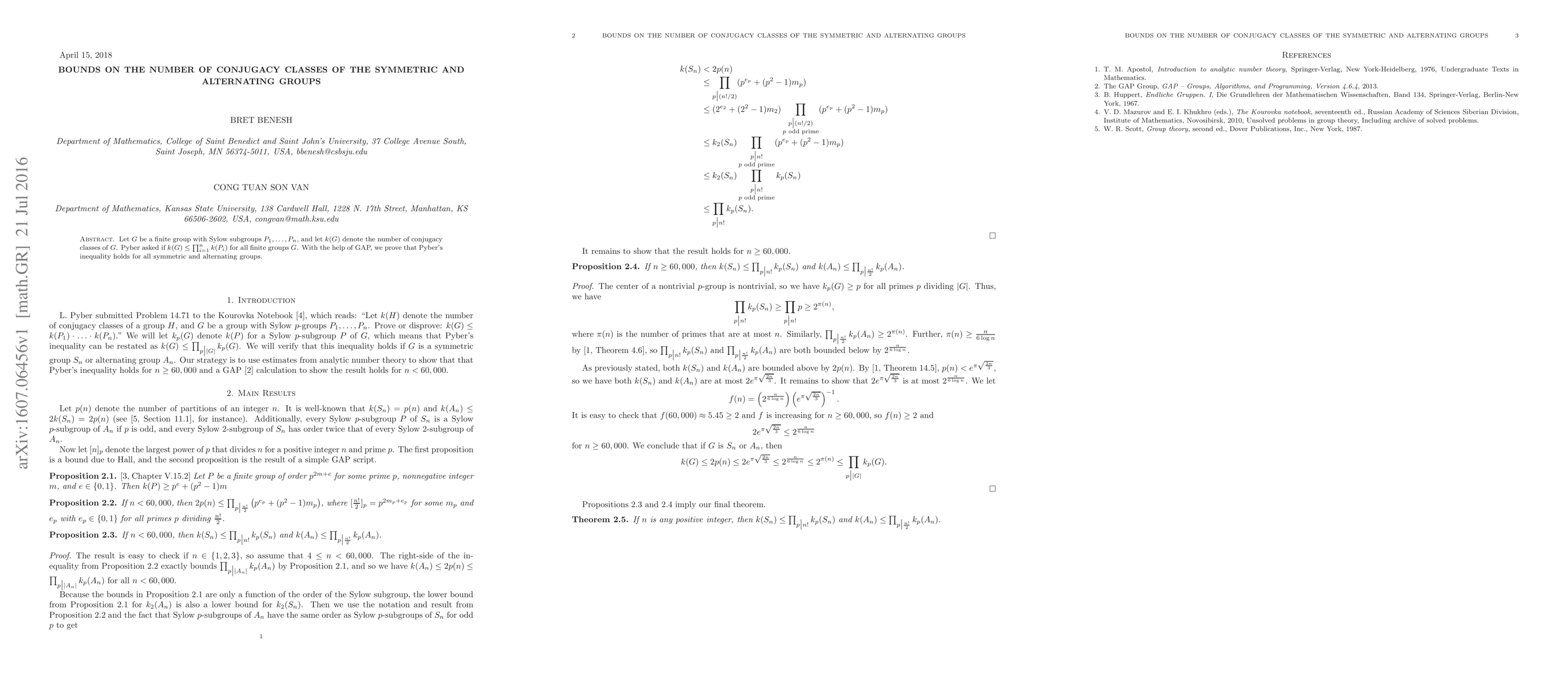 This research proves Pyber's conjecture, showing that the number of conjugacy classes in symmetric and alternating groups is bounded above by the product of the number of conjugacy classes in their Sylow subgroups, using computational methods with the GAP software.