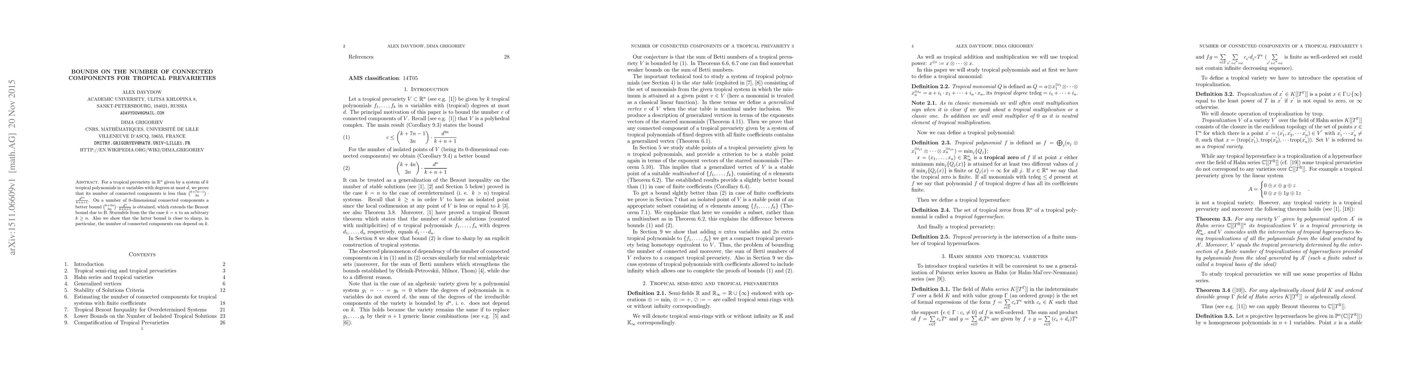For a tropical prevariety in ${R}^n$ given by a system of $k$ tropical polynomials in $n$ variables with degrees at most $d$, we prove that its number of connected components is less than ${k+7n-1 \choose 3n} \cdot \frac{d^{3n}}{k+n+1}$. On a number of $0$-dimensional connected components a better bound ${k+4n \choose 3n} \cdot \frac{d^n}{k+n+1}$ is obtained, which extends the Bezout bound due to B.~Sturmfels from the the case $k=n$ to an arbitrary $k\ge n$. Also we show that the latter bound is close to sharp, in particular, the number of connected components can depend on $k$.
