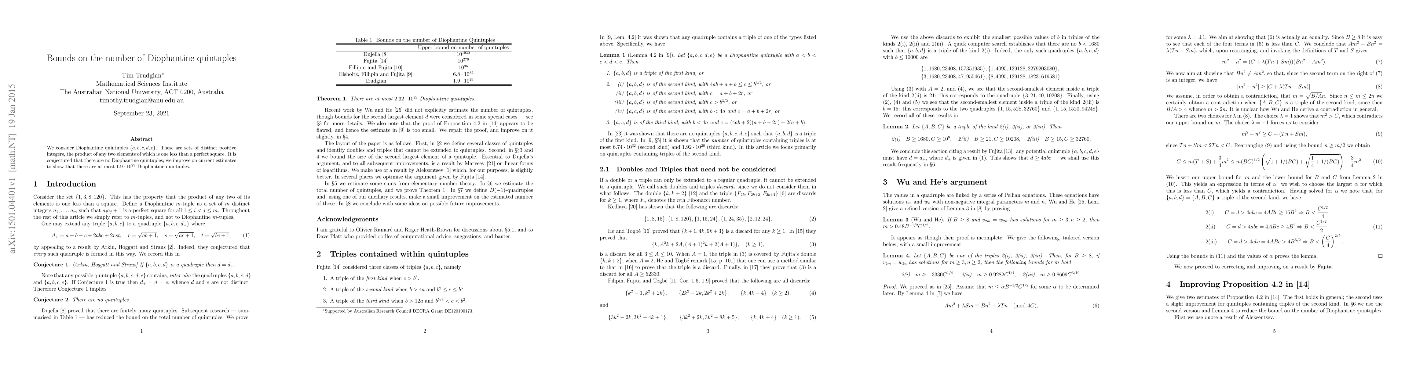 This paper investigates Diophantine quintuples, sets of five distinct positive integers where the product of any two elements is one less than a perfect square. The authors improve previous estimates, proving that there are at most $1.9 \cdot 10^{29}$ such quintuples, supporting the conjecture that none exist.